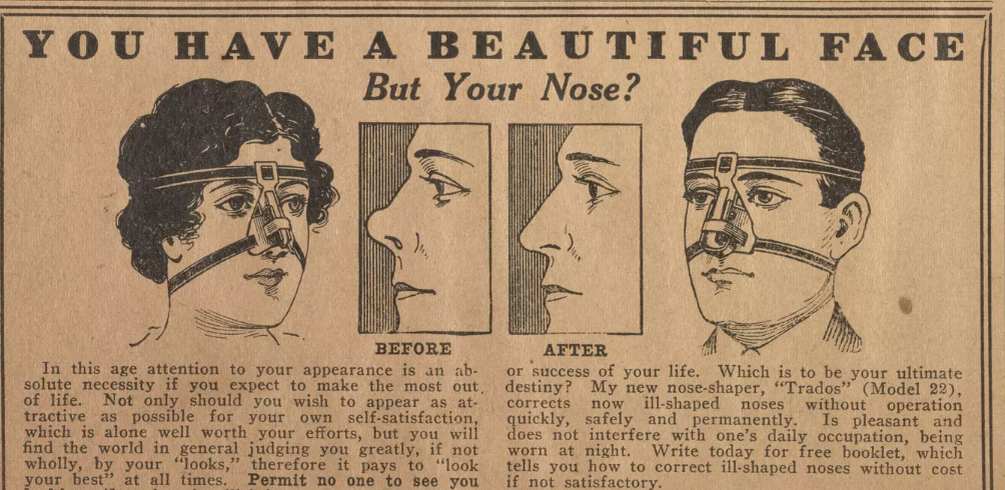 Эта статья будет особенно интересна тем читателям, которые уже успели посмотреть боди-хоррор под названием "Гадкая сестра" этого года. Конечно же вся история вымышленная, это просто интерпретация всем известной сказки "Золушка". Но не все моменты в фильме - вымысел, что-то действительно имело место быть и сегодня об этом поподробнее поговорим! Главной героине Эльвире перед балом делают ринопластику и на какое-то время она вынуждена носить некое приспособление с ремнями, опоясывающими голову и железным материалом, закрывающим её нос. Действительно, когда-то очень давно такое устройство применялось и пользовалось большой популярностью. Перевод: У тебя красивое лицо, но не нос? В наш век внимание к своей внешности является абсолютной необходимостью, если вы хотите извлечь