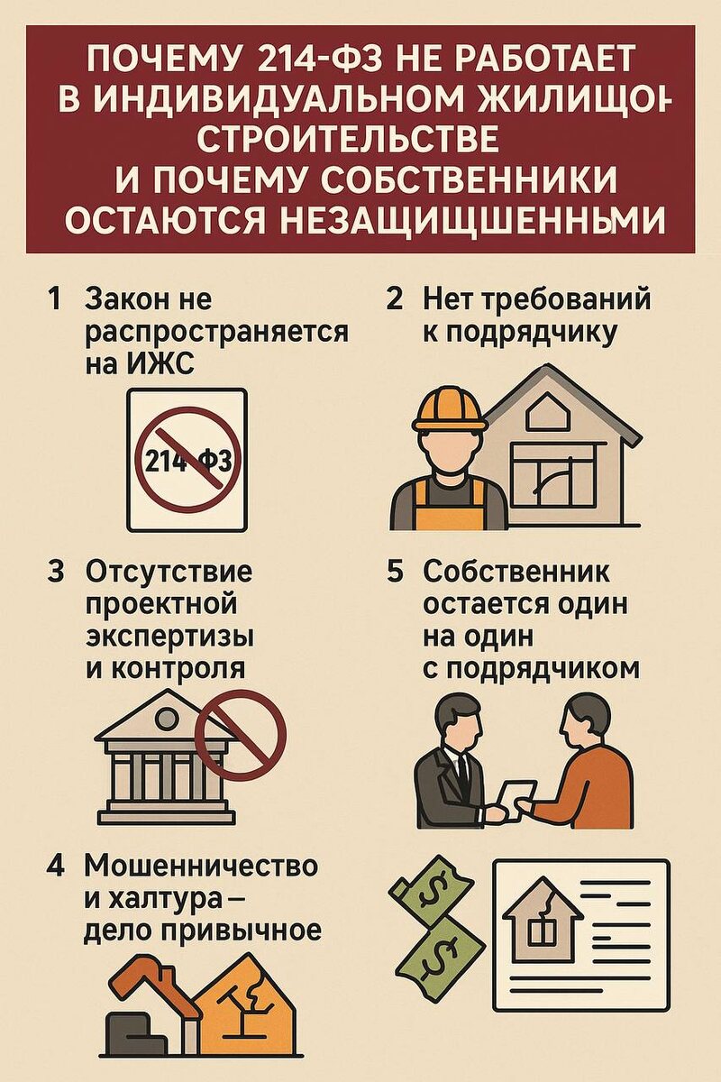 Почему 214-ФЗ не работает в ИЖС и почему собственники остаются без защиты? Закон 214-ФЗ защищает дольщиков в многоквартирных домах. Но в индивидуальном строительстве (ИЖС) он не работает, и вот почему: 1️⃣ Закон не распространяется на ИЖС — он про многоквартирные дома, а частный дом по договору подряда — совсем другая история. 2️⃣ Требований к подрядчику нет. Строить может кто угодно. Лицензии, допуски, опыт — необязательно. Хоть с такси вчера. 3️⃣ Проект — без контроля. Чаще всего это схема «от руки», сделанная фрилансером. Экспертизы нет, надзора нет, норм безопасности никто не проверяет. 4️⃣ Мошенничество и халтура — норма. Предоплату взяли, исчезли. Или построили абы как — без технологий и соблюдения СНиПов. 5️⃣ Собственник остаётся один. Нет ни банка, ни эскроу, ни технадзора. Только вы и прораб, и то — если повезёт. 6️⃣ Государство не вмешивается. Всё на вашей ответственности: от проектирования до контроля качества. Вывод: 214-ФЗ — бронежилет для долевки. ИЖС — охота без лицензи