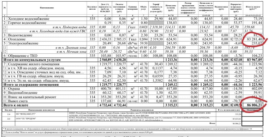 В "Челнинские известия" обратился мужчина, проживающий по адресу - проспект Сююмбике, 36. Ему вновь пришел огромный счет за жилищно-коммунальные услуги. В квитанции за апрель 2025 года указана космическая сумма за квартиру в 41,7 квадратных метра и одним прописанным - 86 тысяч рублей. Большая часть суммы за отопление 83 тысячи рублей. Откуда управляющая компания "Формула дома" берет такую сумму, когда жилец исправно платит, он не понимает. Причем уже не первый раз. Напомним, житель Челнов уже обращался в наше издание. За декабрь 2024 года управляющая компания начислила ему 87 тысяч рублей, из них за отопление - 84 тысячи рублей. В прошлый раз, после публикации, управляющая компания признала свою ошибку и извинялась перед жителем. Возможно, ситуация повторится.