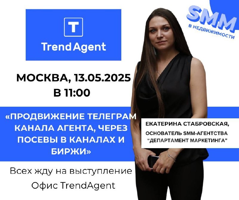 Москва. TrendAgent. 13 мая. Стартуем в 11:00! На сцене — я, Екатерина Стабровская, основатель SMM-агентства “Департамент Маркетинга”, лучший маркетолог в недвижимости по версии Всероссийского Жилищного Конгресса! ⸻ Тема моего выступления: «Продвижение Telegram-канала агента через посевы в каналах и биржи» Что вас ждёт: — Почему Telegram — не просто канал, а реальный инструмент продаж для агента — Как работают посевы (без воды и мифов) — Где искать посевы: реальные площадки, а не “каталоги ради галочки” — Как грамотно заходить в посевы и не сливать бюджеты — Как оценить результат через простые метрики — ТОП-ошибки агентов при продвижении через пассевы — Стратегия на 3 месяца вперёд для реального роста канала ⸻ Будет: ✅ Живая практика ✅ Чек-листы ✅ Реальные примеры ✅ Мои собственные кейсы из недвижимости ⸻ Хотите, чтобы ваш Telegram-канал продавал, а не просто висел в профиле? Тогда приходите — прокачаем ваш канал вместе! 13.05.2025 / Москва / Офис TrendAgent / 11:00 До встре