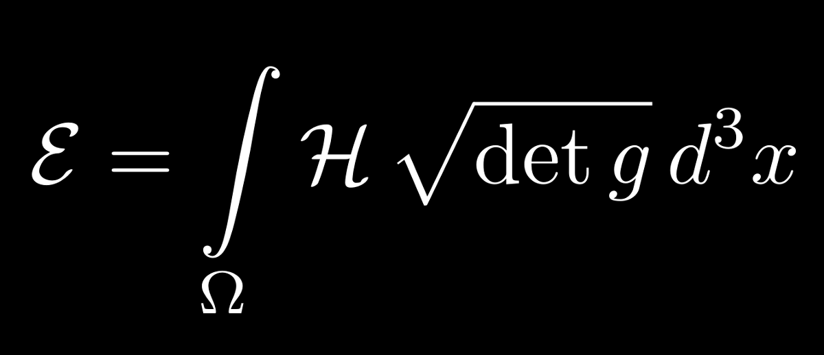 Через 𝓗 в формуле закона сохранения энергии обозначена суммарная плотность энергии всех полей, включая и гравитационное поле. Через 𝓙 в этой формуле обозначен вектор суммарной плотности потока энергии всех полей, включая и гравитационное поле. Компоненты этого вектора пронумерованы верхним индексом i. Эти же величины входят в дифференциальную форму закона сохранения энергии: