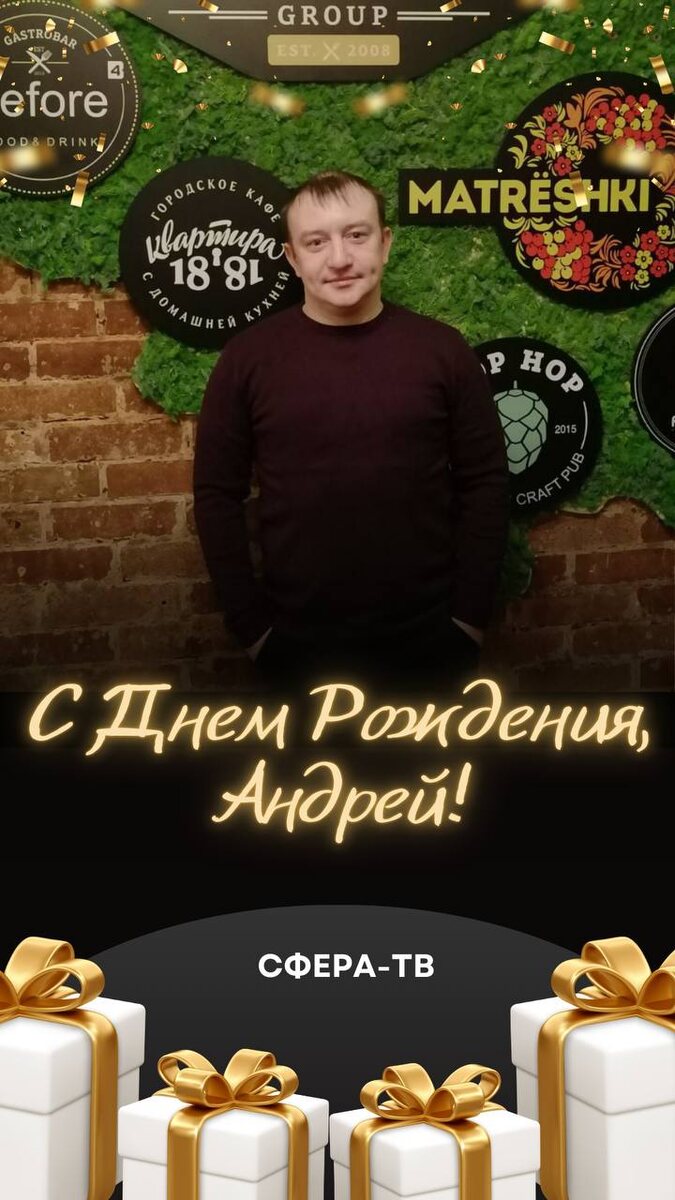 Май на «Сфере-ТВ» богат на Дни Рождения! ✨ Сегодня свой день отмечает наш коллега, телеоператор канала «Сфера-ТВ» — Рудаков Андрей Сергеевич! 🎂 Андрей Сергеевич имеет огромный трудовой стаж! На телеканале он с 2001 года! Андрей, от всей души благодарим тебя за многолетний труд, высокий профессионализм и отзывчивость. Ты — человек, на которого всегда можно положиться! 💪 Желаем крепкого здоровья, счастья, душевного тепла, удачи во всех делах и ярких, радостных моментов каждый день. ✨ Пусть работа приносит удовольствие, а рядом всегда будут семья, надёжные люди и верные друзья! С ДНЕМ РОЖДЕНИЯ!🎈🎁🎉