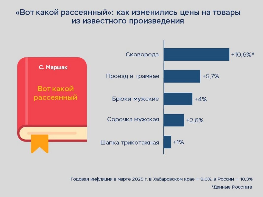 В этом году одному из популярных детских стихотворений Самуила Маршака «Вот какой рассеянный» исполняется 95 лет. Это хороший повод вспомнить его сюжет, перечитав произведение или еще раз посмотрев популярный советский мультфильм, снятый по его мотивам. А экономисты Отделения Банка России по Хабаровскому краю рассказали, как изменились цены на товары и услуги, так или иначе связанные с известным персонажем, и как политика регулятора помогает снизить инфляцию. В расчетах использованы данные Росстата за март 2025 года. Начнем, пожалуй, с рубашки, вместо которой невнимательный герой пытался надеть брюки. По сравнению с февралем 2025 года в Хабаровском крае цены на эти предметы мужского гардероба не изменились. При этом в течение года цены на одежду повышались из-за роста издержек производителей на импортные ткани, фурнитуру, оборудование, заработную плату персонала и содержание помещений. Поэтому в целом за 12 месяцев мужская сорочка и брюки стали дороже примерно на 3 и 4% соответственно.