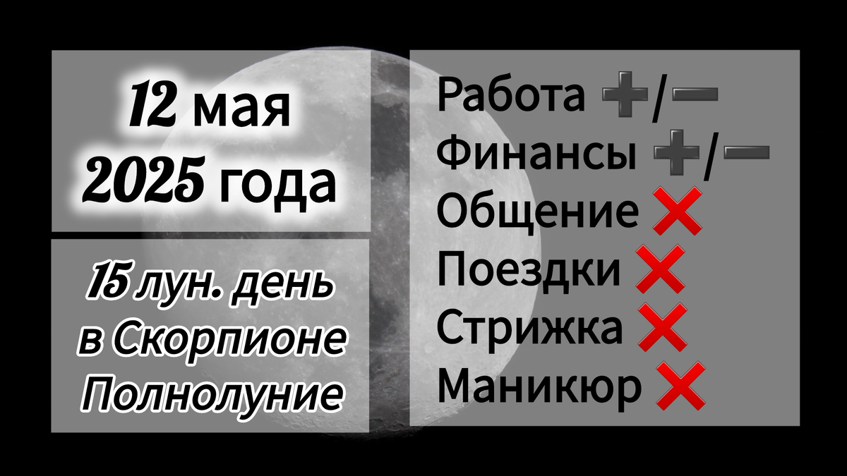 Наступает неблагоприятный день для начала любой деятельности, новых начинаний и принятия ответственных решений. Не стоит браться за масштабные проекты. Лучше посвятить день простым текущим делам. В этот день стоит отказаться от крупных финансовых операций, покупок и инвестирования. Не давайте деньги в долг. В общении существует высокий риск конфликтов, поэтому не стоит назначать важные встречи и свидания. Повышается чувствительность к словам и обидчивость. Откажитесь от лишних поездок, так как повышается риск травматизма. В 19 часов 55 минут наступит Полнолуние в Скорпионе. В первую очередь это тяжелое время для общения. Это пора наибольшего энергетического подъема, в том числе и в эмоциях. Они достигают предела. Нужно быть осторожными, чтобы сильная лунная энергетика не «полилась через край» и не вызвала конфликтов и разрушений. Если отношения в семье нестабильны, дистанцируйтесь на время от общения. В этот день практикуйте умеренность во всем: в еде, эмоциях, физических нагрузка