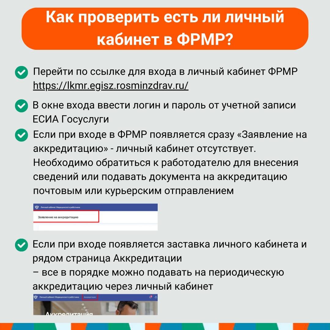 Как проверить есть ли личный кабинет в ФРМР? Делимся шпаргалкой! Обязательно проверьте перед отправкой, есть ли у вас личный кабинет ФРМР. ‼️ Если кабинет есть, документы, направленные почтой, не примут. 1️⃣Перейти по ссылке для входа в личный кабинет Федерального регистра медицинских и фармацевтических работников (далее - ФРМР) https://lkmr.egisz.rosminzdrav.ru/ 2️⃣В окне входа ввести логин и пароль от учетной записи ЕСИА Госуслуги. 3️⃣Если при входе в ФРМР появляется сразу «Заявление на аккредитацию» - личный кабинет отсутствует. Необходимо обратиться к работодателю для внесения сведений или подавать документа на аккредитацию почтовым или курьерским отправлением 4️⃣Если при входе появляется заставка личного кабинета и рядом страница Аккредитации – все в порядке можно подавать на периодическую аккредитацию через личный кабинет МЕДИАТОР Лицензия, ФИС ФРДО. Официальный провайдер портала НМО. Наш сайт: https://mediator-med.ru Телефон: 88001007226 Задать вопрос: @anna_nmo
