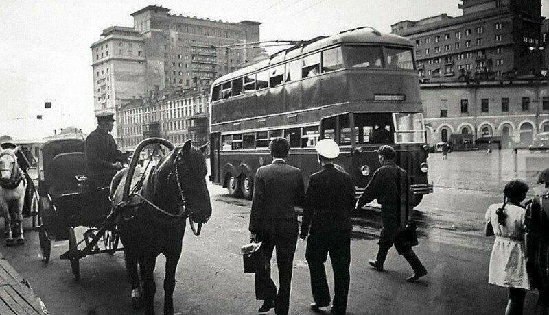 Извозчик и двухэтажный троллейбус на площади Свердлова, Москва, 1939 год
