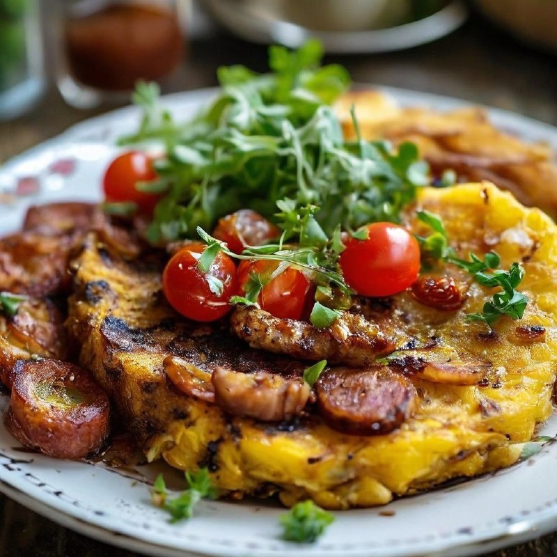 Золотистый плантан хрустит снаружи и тает внутри, омлет — как облако, овощи дают сочность, а копчёная колбаса добавляет глубину. И всё это — под аккорд лайма. Это блюдо пробуждает, вдохновляет и заряжает на великие дела. Начни день с яркого вкуса — и день ответит тебе тем же.