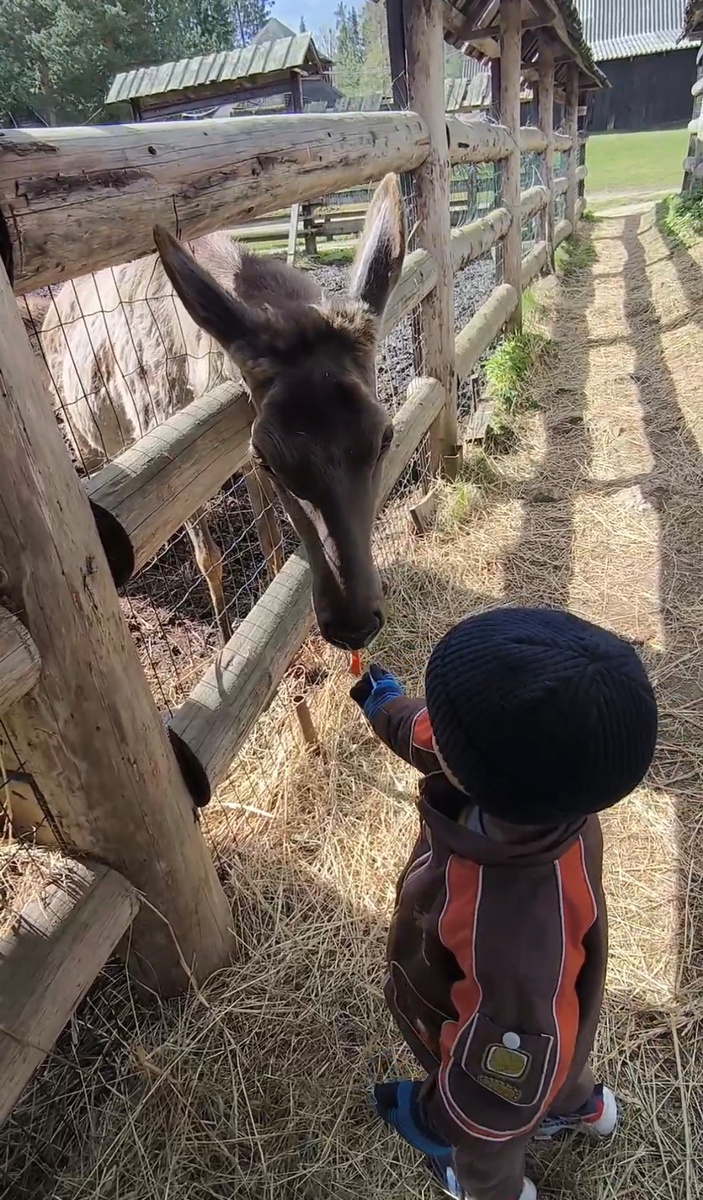 Перед выездом на отдых я проверяла погоду в Вербилках - обещали дожди, поэтому я взяла резиновые сапоги себе и Артуру, но они не пригодились. С самого утра было солнышко, хоть и свежо. Мы позавтракали и сразу пошли в зоопарк. Помимо резиновых сапог я везла из Москвы 1,5 кг порезанной на брусочки моркови для местных обитателей, поэтому и северные, и пятнистые олени, и козы, и овцы, и шиншилла получили свои вкусняшки. Лошадок и пони мы угостили яблоками со шведского стола, а кроликам досталось одно из целых яблок, предназначенных Артуру. Сначала они не знали, что с ним делать, но потом у самого ловкого получилось отгрызть кусочек и дальше всё пошло веселее. На обратном пути из зоопарка мы немного понаблюдали за платной рыбалкой - на креветку ловили форель. Никакого тебе терпения, ожидания, удачи - только закидывай удочку и вытаскивай рыбу. Потом мы взяли купальники и пошли в... игровую комнату. Расчет был на то, что Артур там поиграет, а я пойду в помещение рядом и поплаваю. И он даже