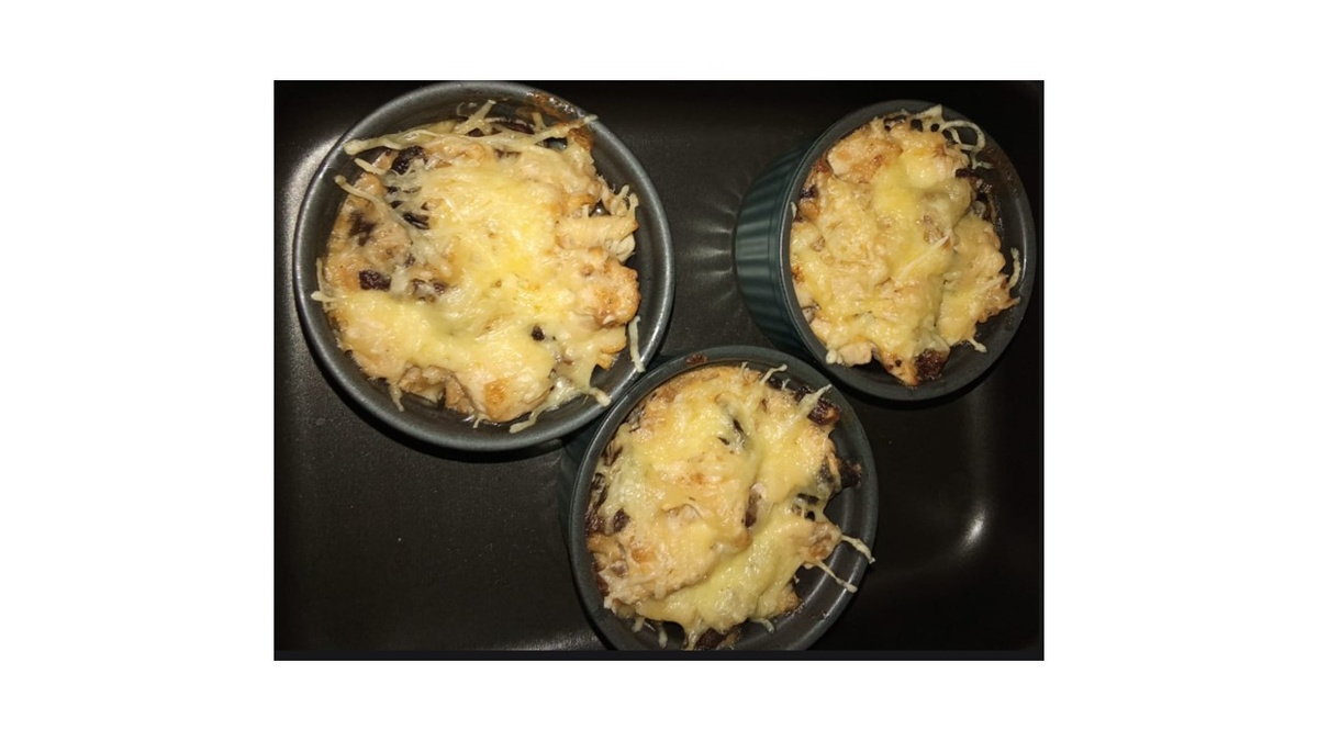 На 8 порций потребуется 2 крупных куриных филе грудки, 200 г грибов, 1 средняя луковица, 2 ст. л. муки пшеничной, сливки 20% - 200 г, кусочек сливочного масла, сыр твердый тертый - 200 г, формы для запекания.