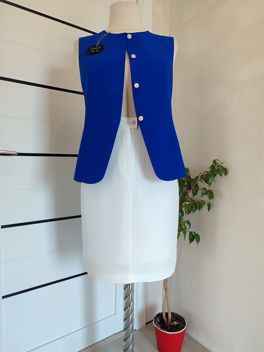 Костюмчик с двумя юбочками, покороче 💙 и подлиннее 🤍 с маленьким разрезом сзади. А пуговки❤️. Ткань очень тонкая, прохладная🤍, как легкий ветерок с моря 💙 Весь костюмчик на тонком подкладе❤️Жаль манекен полноват для моих стройных,красивых девочек❤️, пуговицы не сходятся❤️ #пошивназаказ #сшитьназаказ #летнийкостюм #пошивкропоткин #пошивгулькевичи