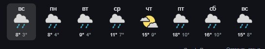 Отгадайте в какой день на предстоящей неделе погода позволит делать доставку? Можно вспомнить, что человек царь природы, реки разворачивает и в космос полетел. Конечно мы можем загрузить под дождем, привезти под дождем, разгрузить и донести до места. Любой каприз за Ваше золото. Но, если говорить о нормальной доставке за нормальную цену - погода важна. Если Вы не хотите видеть в стоимости доставки цифру включающую в себя щедрый бонус "за погодные условия", посматривайте в прогноз.