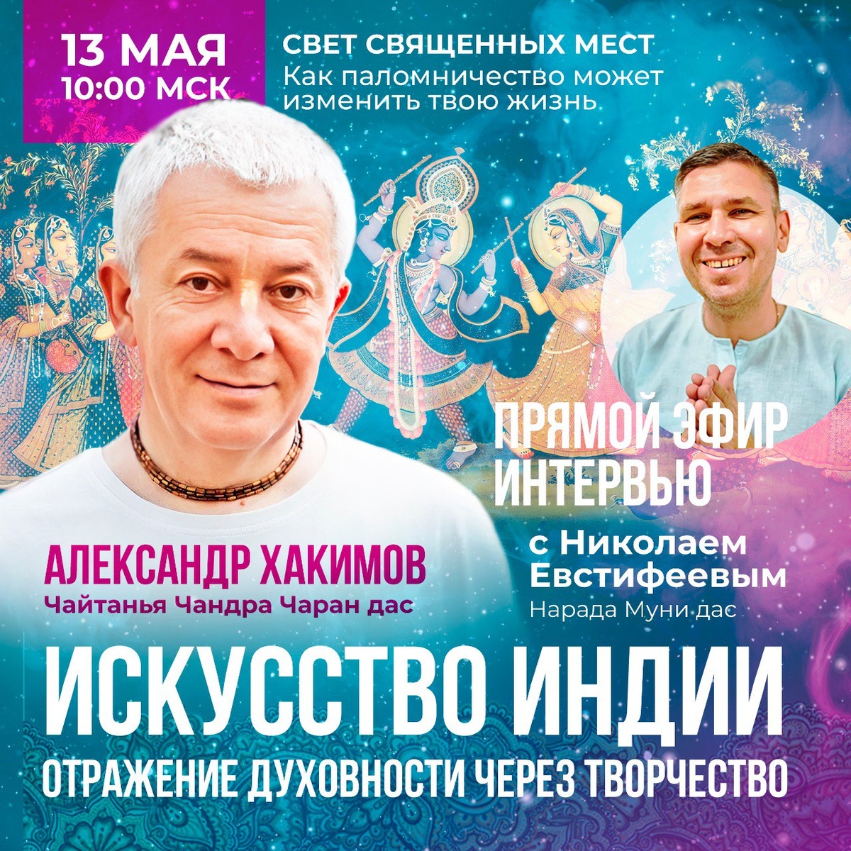 ✨СВЕТ СВЯЩЕННЫХ МЕСТ: Как паломничество может изменить твою жизнь 13 мая в 10:00 (мск) приглашаем вас на особенный прямой эфир-интервью из цикла встреч о паломничестве и духовных открытиях! ⭐️ГОСТЬ ЭФИРА — Александр Хакимов (Чайтанья Чандра Чаран дас) Александр Хакимов — известный художник, писатель, философ, духовный учитель и путешественник. Он более 40 лет изучает индийскую культуру и философию, является автором множества книг и лекций по ведической традиции. Его глубокие знания и вдохновляющий опыт помогают тысячам людей по всему миру раскрывать новые горизонты духовности. 🎨ТЕМА ВСТРЕЧИ — "Искусство Индии: Отражение духовности через творчество" Вместе с Александром Хакимовым мы поговорим о том, как искусство становится проводником к внутреннему свету, почему творчество в Индии всегда связано с поиском высшего смысла, и каким образом паломничество помогает открыть новые грани себя через соприкосновение с красотой и традициями священных мест. ❓ Как паломничество влияет на воспри