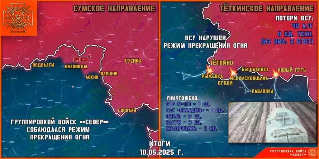 10 мая подразделения группировки войск "Север" отразили несколько попыток прорыва со стороны украинских формирований на направлениях Теткино и Новый Путь в Курской области. Несмотря на соблюдение режима прекращения огня со стороны российских военных, противник продолжал вести штурмовые действия.