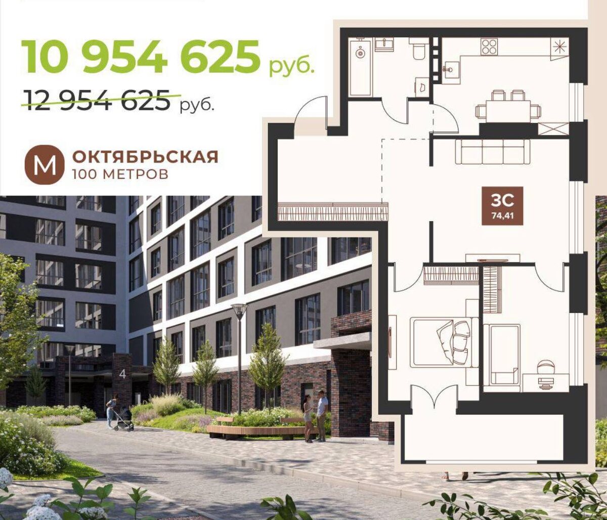 3к студия 74 кв.м. в 100 метрах от метро. Октябрьская. 146 тыс за квадрат🔥