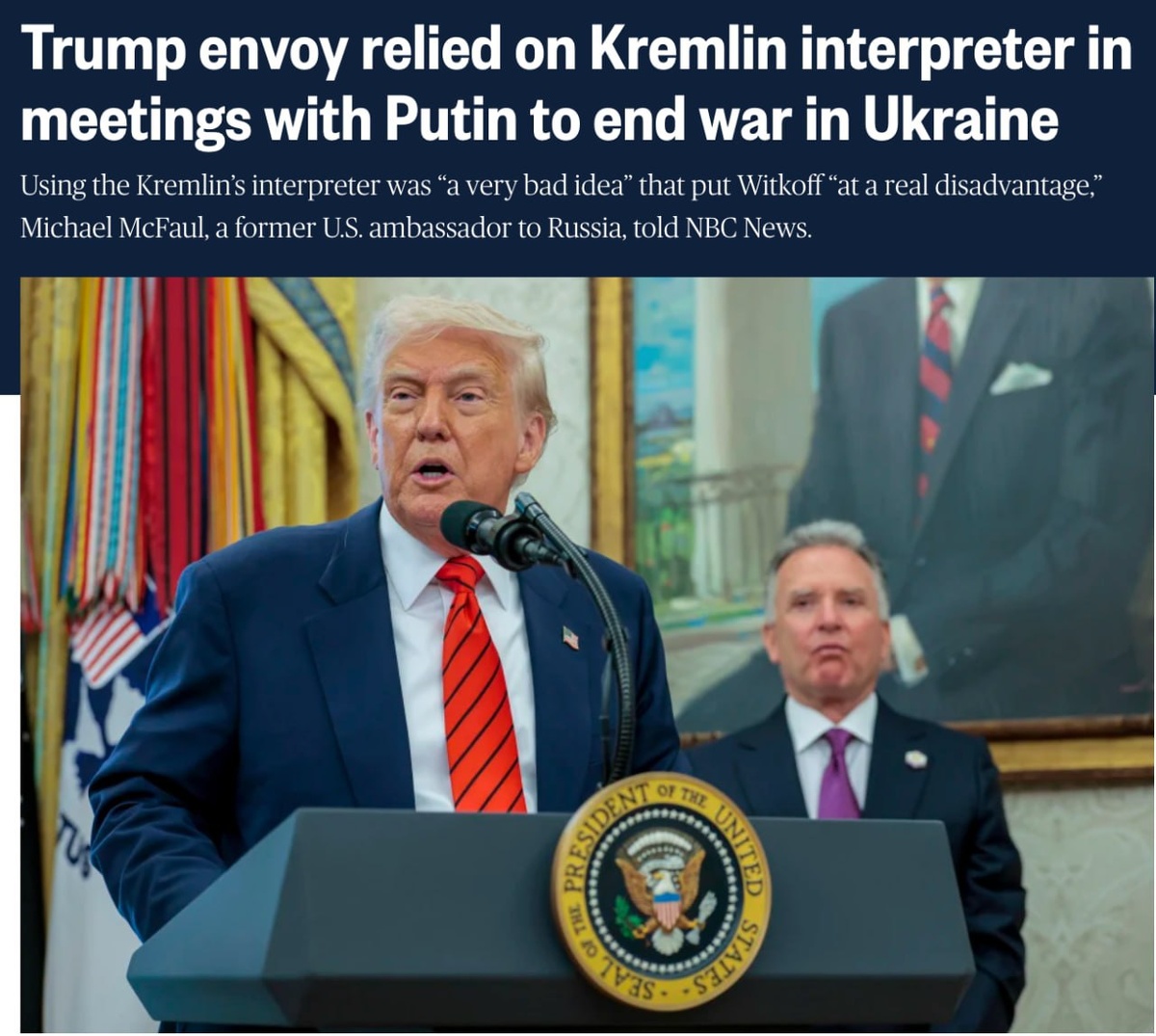 Американские антитрамповские СМИ в очередной раз медийно торпедируют фигуру спецпосланника Трампа Стива Уиткоффа. На этот раз поводом для компрометирующего материала NBC News стало утверждение, со ссылкой на неких неназванных источников, будто Уиткофф нарушил давний протокол, не использовав собственного переводчика во время трех встреч на высоком уровне с Путиным, вместо этого положившись на переводчиков из Кремля. «Если они говорят друг с другом по-русски, он не понимает, что они говорят», – добавил чиновник, имея в виду Путина и переводчиков. NBC News отмечает, что Уиткофф не владеет русским языком. «По словам двух бывших американских послов, пользуясь услугами переводчиков Кремля, он рисковал пропустить некоторые нюансы в сообщениях Путина и не смог бы самостоятельно проверить то, что ему говорили», – говорится в публикации. Парируя эти обвинения, Анна Келли, заместитель пресс-секретаря Белого дома, заявила, что Уиткофф «соблюдает все протоколы безопасности в координации с Государс