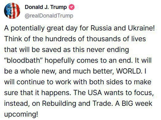 Трамп после предложения Путина о прямых переговорах опубликовал пост в соцсети Truth Social: «Потенциально великий день для России и Украины! Подумайте о сотнях тысяч жизней, которые могут быть спасены, если эта бесконечная «кровавая баня» наконец-то, как мы надеемся, закончится. Это будет совершенно новый и гораздо лучший мир. Я продолжу работать с обеими сторонами, чтобы убедиться, что это произойдет. США хотят сосредоточиться на восстановлении и торговле. Наступает большая неделя», — написал Трамп.