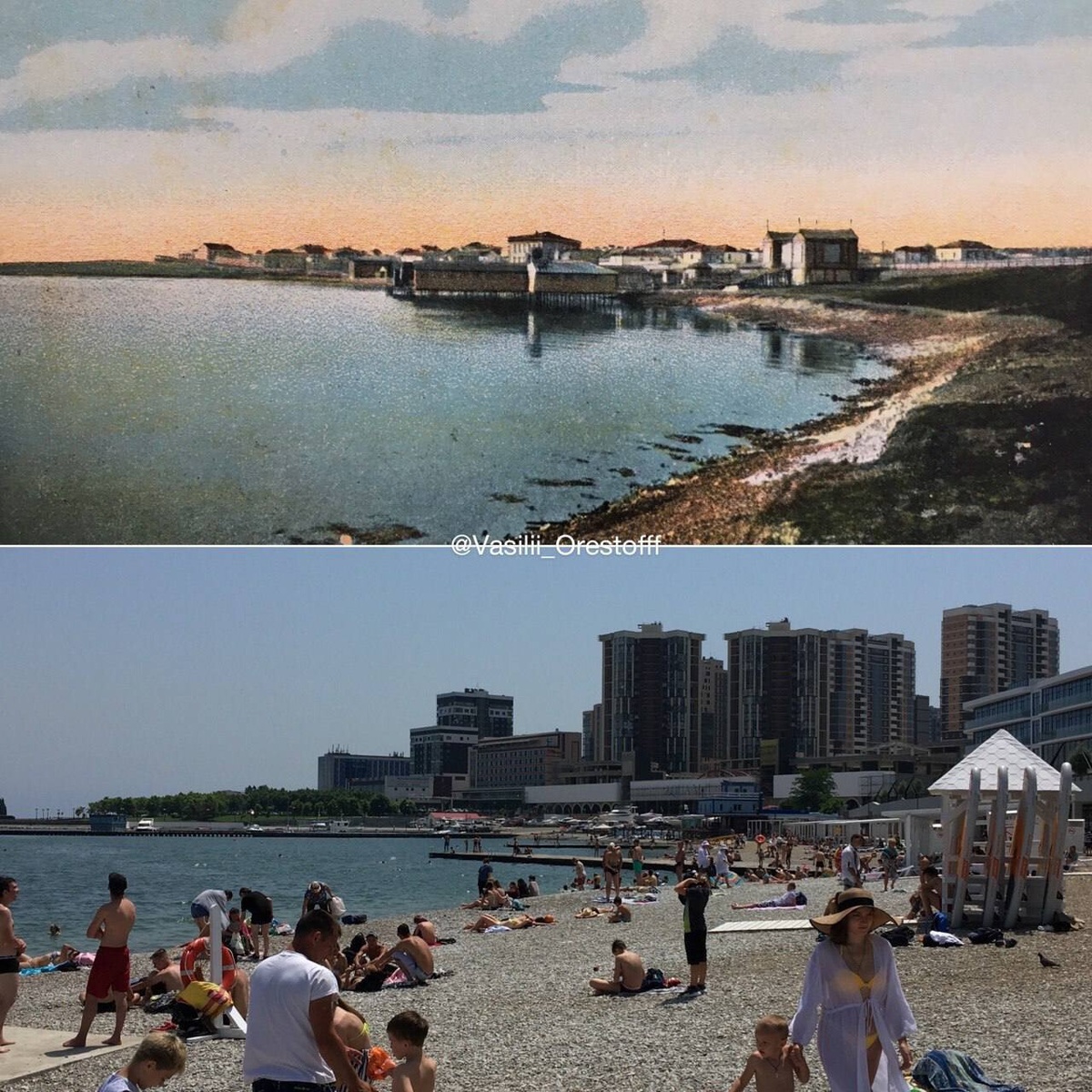 Новороссийск, Галатская бухта, район Курортной площади, левее Коровий мыс - он же мыс Любви, начало XX века. В центре кадра купальни товарищества «Курорт». Сегодня это просто горпляж. 📲 @nvrsk_online