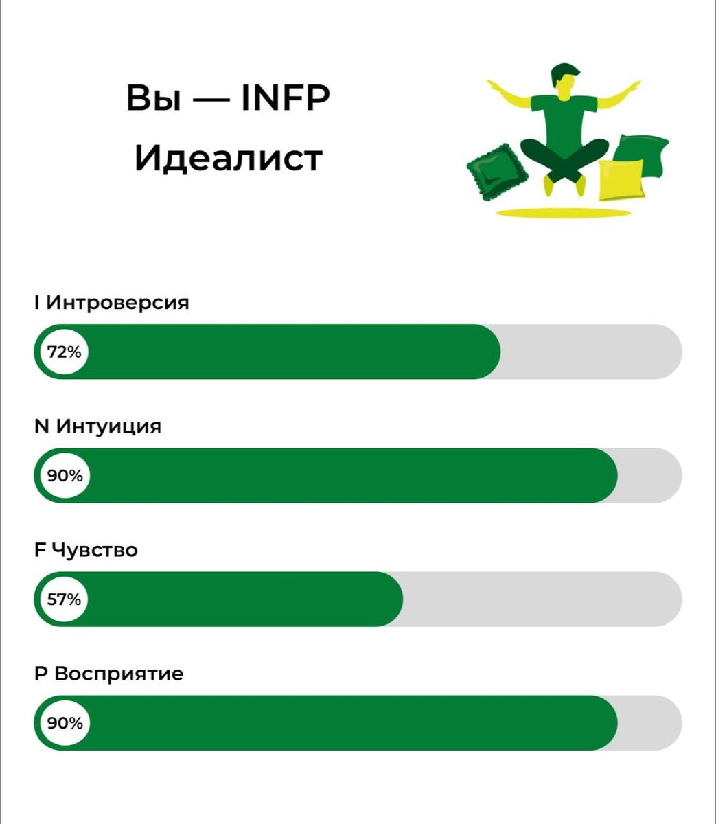 Прошёл тест Майерс-Бриггс (MBTI) — снова. Теперь я INFP — Идеалист. Что это значит: Тип, который живёт идеями, работает с душой, стремится к гармонии и свободе. Ненавидит жёсткий контроль, но способен создавать сильные проекты в одиночку. Деньги? Не самоцель, главное — смысл, красота, развитие. Какая профессия ближе? Скорее психолог, бизнес-тренер или HR, чем военный или техник. Ярко, нестандартно, но глубоко внутри — сражаюсь с завышенными стандартами, самооценкой и вечной борьбой «идея против дедлайна». Интересно, пару лет назад у меня был другой тип. Видимо, расту. Или раскрываю новые грани.