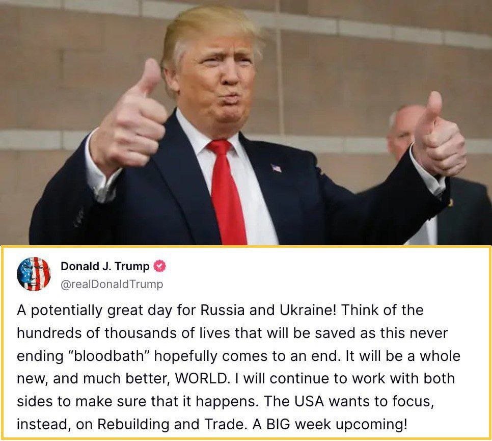 А вот и реакция Трампа на фактический отказ путина от ультиматума "лиги озабоченных" : «Это потенциально большой день для России и Украины». «Подумайте о сотнях тысяч жизней, которые будут спасены, когда эта бесконечная «кровавая баня», надеемся, закончится. Это будет совершенно новый, гораздо лучший МИР. Я буду продолжать работать с обеими сторонами, чтобы убедиться, что это произойдет. США хотят сосредоточиться на восстановлении и торговле. Впереди Большая неделя!».
