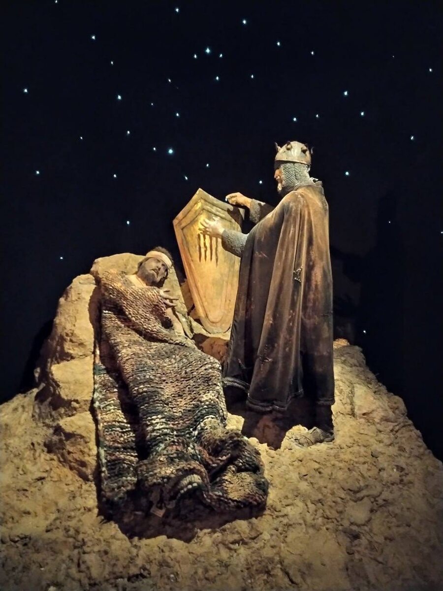 Я очень люблю геральдическую мифологию в стиле «и вот наш великий предок сразил дракона/великана/докучливого соседа и оттуда есть пошел наш герб/флаг/гимн». Недавно посчастливилось побывать в Барселоне, поэтому поделимся с вами Каталонским вариантом подобной истории. Что на картинке: тот, который лежит и помирает — Вифред Волосатый (или на местном Guifré el Pilós). Не волнуйтесь, всё с ним будет нормально, он выживет и даже станет графом. Над ним в шлеме-короне стоит то ли Людовик Благочестивый (сын Карла Великого), то ли Карл II Лысый (внук; а есть волосы или нет — под шлемом не видно). Считается, что дело было так: Жифре воевал на стороне короля Франков против мавров, захвативших земли будущей Каталонии: Террагону, Жирону и даже Барселону (или Барсино), которая в те времена не была таким уж важным городом. После битвы, в которой Жифре отличился храбростью, но был сильно ранен, он лежал перевязанный в своей палатке. Сам король явился проведать его там, и увидел что на позолоченном
