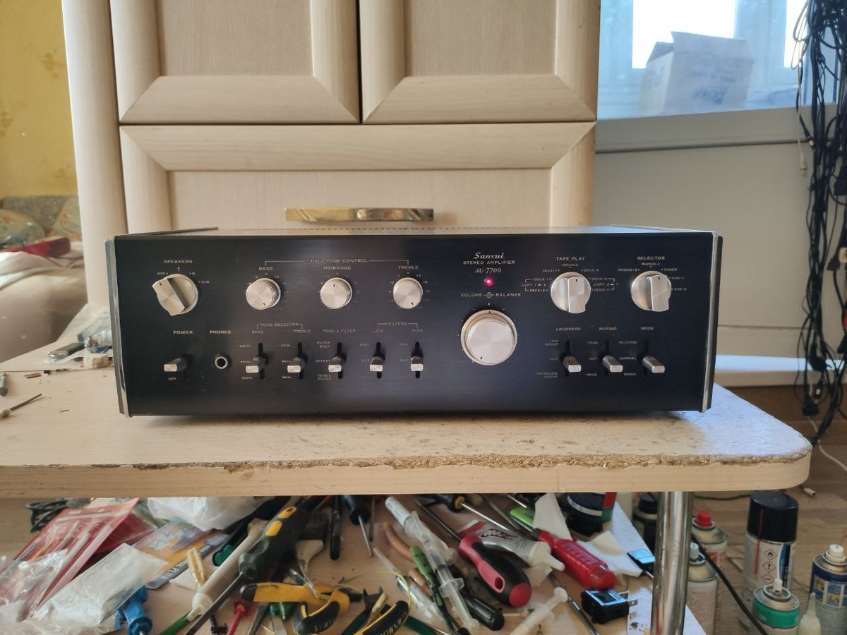 Sansui AU-7700.Пострадавшая Сансуйка, а именно, ткнули в 220, сто вольтовый аппарат. 🙄Да сколько можно, но тем не менее, несëм потери и к сожалению одним сгоревшим предохранителем не получилось отделаться.В одном из каналов все-таки пробило два выходных транзюка.Хорошо что нашел новые оригинальные 2SA808 из старых запасов, потому что ставить китайский новодел, это мягко говоря не комильфо. 😌Заменили, настраиваем токи и нолики и слушаем. 😇Сансуевский жир из семидесятых, тягучийу бас, звенящий верх, кому то и такое нравится, я уже от такого звука честно говоря отвык, хочется чего-то то более "быстрого" и не настолько "размазанного", но тут уже дело вкуса. 😝Сансуй тех лет всё же звучит, пусть и не всегда и в полном объёме справляется с современными записями, хотя это может и не проблема сансуя, а мастеринга и "войны громкостей".😏