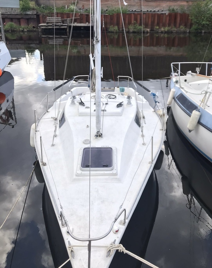 Есть у нас с мужем мечта, когда выйдем на пенсию-бороздить моря и океаны на яхте. Прошли курсы в Крыму, брали в аренду там же яхту и ходили из Севастополя до Ялты, потом еще с командой ходили из Новороссийска до Севастополя. Яхту хотим футов 35-40. Покупать планируем лет через 10. После новогодних праздников, насмотревшись фильмов про яхтинг и море, в очередной раз залезаю на Авито посмотреть что и по чем предлагают на рынке. Натыкаюсь на неплохую с виду яхту, миниатюрных размеров, больше похожую на игрушку имитирующую океанскую и очень недорогую. Показываю мужу, а где подвох? Он посмотрел и завис на неделю. Говорит, неплохая яхта и реально недорого. Изучил такие же яхты. Нева-2, если что. Надо брать, сказал. Потренируемся на ней перед покупкой яхты, о которой мечтаем. Надо так надо. Найти полмиллиона проще, чем 5. Созвонились с хозяином, забронировали и в феврале муж поехал в Питер и купил эту яхту. Нева-2, класс минитонник с чугунным килем в 400 кг, не швертбот, полностью в стоке, без колхоза, блоки плавучести все на месте, благодаря чему яхта полностью непотопляемая, не уйдет под воду при любых повреждениях. Рангоут, Бегучий и стоячий такелаж визуально в хорошем состоянии. Корпус без осмоса, ровный, без следов повреждений и ремонта. Все что требовалось по корпусу-это обновить антифулинг. Из доп оборудования установлен морской карт плоттер рэймарин, с датчиком эхолота, так же этой фирмы, установлен финский блок берегового питания, ходовые огни, якорный огонь на топе мачты, в общем, все первой необходимости. Гардероб парусов состоял из классического грота с лэйзи бэг для укладки грота на гик, штормового грота, которым ни разу не пользовались. Три стакселя разных размеров и спинакера. Все паруса в хорошем рабочем состоянии без повреждений и готовы к установке. Внутри тоже все в заводском исполнении: салон разделен полупереборкой на две зоны. В носовой части двуспальное место, люк для доступа в форпик и палубный вентиляционный люк. Остальная часть салона состоит из двух диванов вдоль бортов, над каждым из которых по три ящика для хранения. Также два шкафчика для хранения предусмотрены в носовой части, в один из которых вмонтирован электрораспределительный щиток. Электропроводка разведена, но проверить работоспособность проводки и установленных электроприборов возможности не было, тк не было АКБ. К яхте прилагался подвесной мотор Хонда 4-тактный, 5 лс. Вместе с яхтой продавец отдавал самодельный кильблок, на котором яхта стояла. Стояла на участке у продавца, который любезно разрешил оставить на хранение до открытия навигации. Чтобы придать яхте индивидуальность и презентабельный внешний вид, в апреле муж нашел фирму, которая оклеила борта яхты виниловой пленкой по разработанному нами дизайну за 34000 (материалы+работа). Покраска корпуса обошлась бы в три раза дороже. В мае мы приехали в Питер, чтобы завершить работы по корпусу и подготовить к спуску на воду. Зашкурив днище, были обнаружены несколько небольших точек осмоса, которые были вскрыты и заделаны эпоксидной шпатлевкой. После чего подводную часть корпуса загрунтовали, обезжирили и в два слоя закатали валиками белой необрастающей краской. Результат нас устроил и яхта была готова к спуску. Накануне дня Победы заказали манипулятор для перевозки яхты в предварительно забронированный яхт-клуб