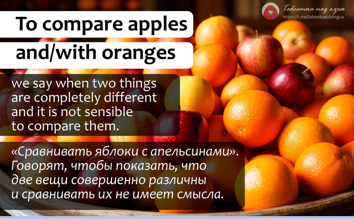 Не сравнивайте яблоки с апельсинами! Так можно сказать в случаях, когда вы видите, что собеседника понесло и вам предлагают некорректные сравнения. 🧀 Ещё можно сказать to compare chalk and cheese («мел и сыр»). 🍏🍊“Compare apples and oranges” — очень популярная идиома, которая используется в повседневной речи, чтобы подчеркнуть несравнимые предметы или события. Казалось бы, почему бы и не сравнить яблоки с апельсинами – оба фрукты, оба круглые, вкусные, сочные. В изначальном варианте (1670 г.) апельсинов и в помине не было, а звучала идиома как «apples to oysters». То есть яблоки сначала пытались сравнивать с устрицами. Конечно, фраза полезная, поэтому есть бездонные альтернативы и в английском, и в других языках. 🐸 Например, в сербском языке сравнивают бабушек и жаб: сходство заключается в словах «бабушка» - Babe, и «жаба» - Žabe, получается забавная рифма. 🍪 В польском сравнивают пряник с мельницей. 🥓 Испанцы говорят confundir la velocidad con el tocino («скорость с бек