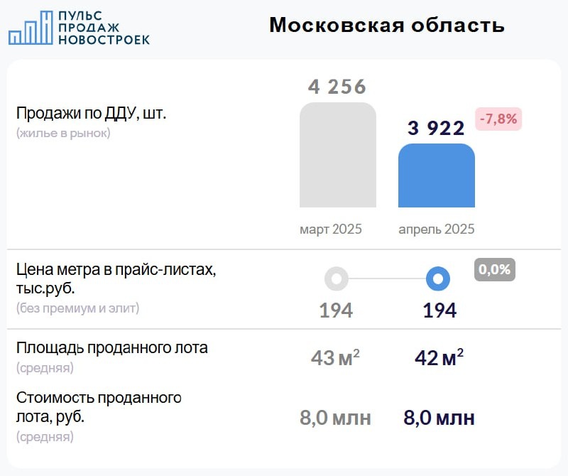 Московская область. Апрель 2025. Итоги продаж по ДДУ. 🏙 Сделки 3 922 сделки по ДДУ в апреле 2025 (-7,8% за месяц). 💰Цены и предложение На конец апреля средняя цена метра составила 194 тысячи рублей, как и в предыдущем месяце (без премиум и элит сегментов). На начало мая (на сегодня) средневзвешенная цена метра не изменилась, 194 тысячи рублей. 🔸Цена метра в сделках с ДДУ выросла до 190 тысяч рублей (+5 тыс. рублей, +2,8%). Средний бюджет покупки остался таким же как и месяцем ранее, в среднем 8,0 млн рублей за лот. Средняя площадь проданного по ДДУ лота в апреле - 42 м² (-1 м² за месяц). 📈 Доля ипотечных сделок 65,0% (в марте было 70,0%). Смотрите детальные графики, топ девелоперов и старты продаж марта на нашем сайте https://pulsprodaj.ru/news/aprel-2025-moskovskaia-oblast/ 🔥 @pulsprodaj