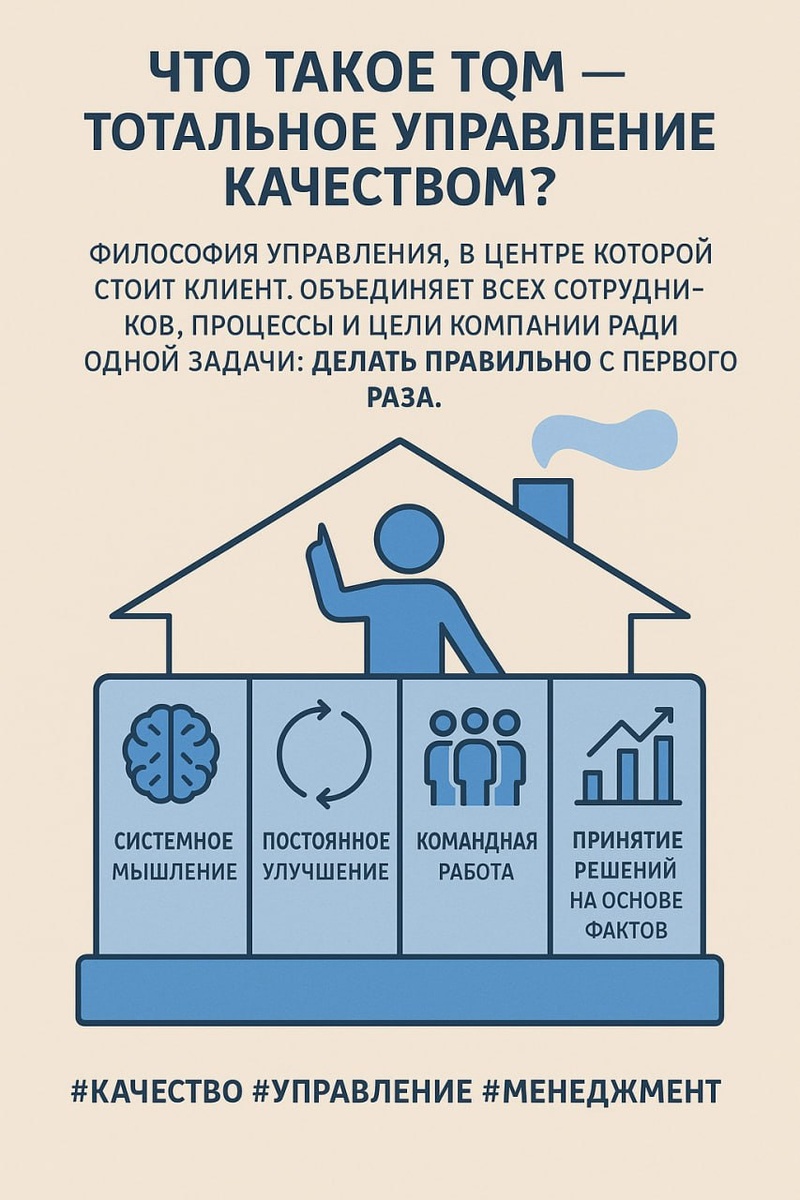 🔹 Что такое TQM — тотальное управление качеством? 📌 Это не просто система контроля брака. TQM — это философия управления, в центре которой стоит клиент. Она объединяет всех сотрудников, процессы и цели компании ради одной задачи: делать правильно с первого раза. В основе TQM: 🧠 системное мышление 🔁 постоянное улучшение 🤝 командная работа 📊 принятие решений на основе фактов 💡 Представьте себе организацию, где каждый — от кассира до генерального директора — думает о качестве. Где проблемы не скрывают, а решают. Где ошибки — не повод для наказания, а шаг к развитию. Такой подход позволяет не просто сократить издержки, но и строить доверие клиентов, укреплять репутацию и расти на рынке. #TQM #MBAg #качество #управление #менеджмент