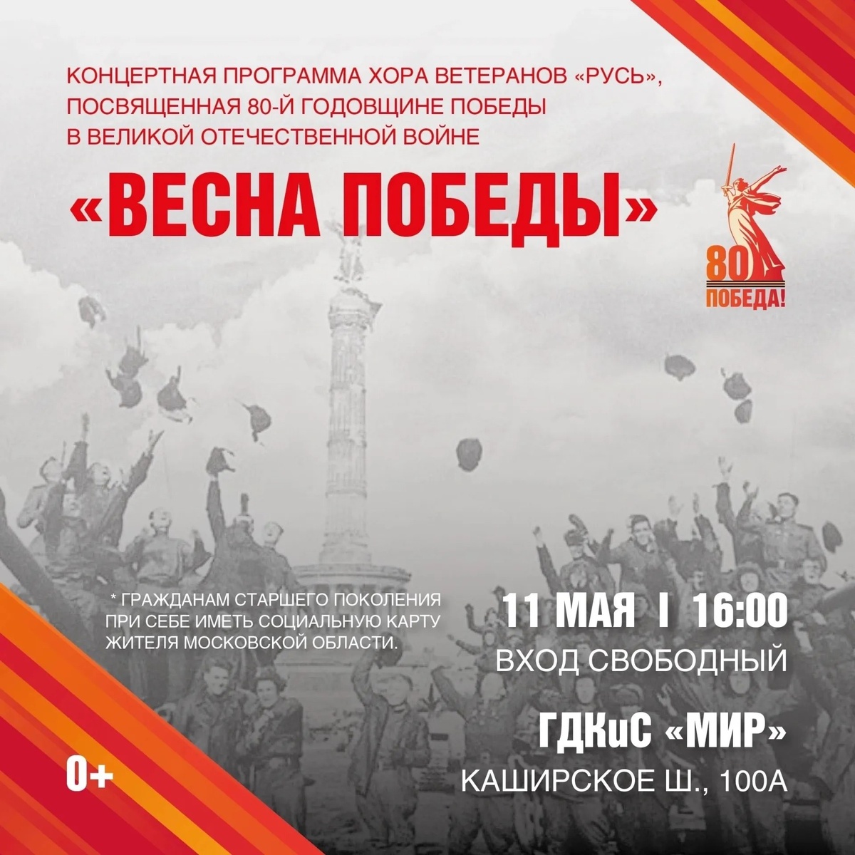 ✨ УЖЕ СЕГОДНЯ! 🎵 КОНЦЕРТНАЯ ПРОГРАММА ХОРА ВЕТЕРАНОВ «РУСЬ» 🎵 Дорогие друзья, приглашаем вас на концертную программу хора ветеранов «Русь», посвященную 80-й годовщине Победы в Великой Отечественной войне. Название программы — «Весна Победы», и в этот день мы будем славить нашу Великую Победу! Вход свободный, но для граждан старшего поколения при себе необходимо иметь социальную карту жителя Московской области. Почувствуйте атмосферу праздника и патриотизма вместе с нами! Ждем вас на этом важном и вдохновляющем событии. До встречи! 🚫 Возраст: 0+ 📆 11.05.2025🕒16:00 🏢 Дворец культуры и спорта «Мир» 📍 г. Домодедово, Каширское шоссе, д.100А 💰 Вход свободный❗️ ✅ Мероприятия Домодедово https://dzen.ru/id/66f10385cc4c5a16f7b5fb02 http://vk.com/domodedovo_events http://dzen.ru/domodedovo_events