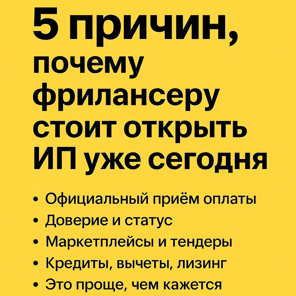 Если вы фрилансер, работаете удалённо, берёте заказы на дизайн, маркетинг, тексты, монтаж или любые другие услуги — вы уже полноценный специалист. Но всё чаще встает вопрос: стоит ли оформлять ИП? Ответ — да, и вот почему. Переходи по ссылке все просто! 1. Официальный приём оплаты Работая без ИП, вы ограничены в способах получения денег. Некоторые клиенты готовы платить только по договору и на счёт. ИП открывает доступ к расчётному счёту, и вы спокойно получаете деньги от физлиц и юрлиц — без серых схем и переводов «на карту другу». ⸻ 2. Доверие и статус Фраза «я оформлю договор от ИП, вышлю чек» звучит гораздо увереннее, чем «скиньте на карту». Уровень доверия растёт — а вместе с ним и средний чек. Для заказчиков вы становитесь не просто исполнителем, а партнёром. ⸻ 3. Доступ к маркетплейсам и тендерам Хотите продавать товары на Wildberries, Ozon или участвовать в тендерах? Без ИП — никак. А с ИП у вас открываются целые рынки, куда физлицам путь закрыт. Это — реальный рост