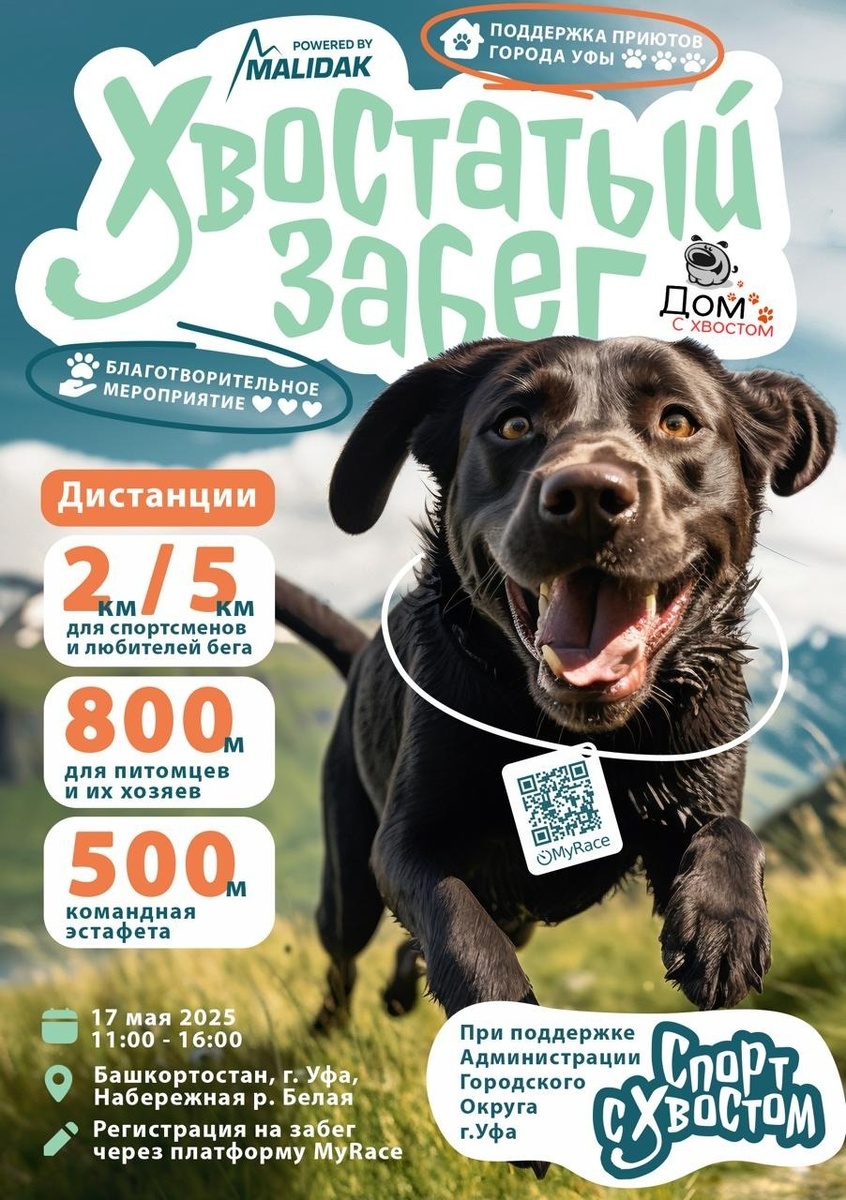 17 мая Уфа станет столицей не только для людей, но и для четвероногих друзей! На набережной реки Белой состоится уникальная акция «Хвостатый забег», которая объединит любителей активного образа жизни и тех, кто просто обожает собак. Мероприятие стартует в 11:00 и подарит участникам море позитива, заряд энергии и незабываемые эмоции. Гостей ждут разнообразные дистанции на любой вкус: «Щенячий восторг» — легкая пробежка на 2 км, «Хвостатый заряд» — более серьезная дистанция в 5 км, 800 метров с питомцами — идеальный вариант для тех, кто хочет провести время вместе со своим любимцем, «Командная эстафета» — увлекательное соревнование на 500 метров для настоящих командных игроков. Особенностью забега станет возможность не только принять участие со своим четвероногим другом, но и познакомиться с подопечными из приютов. Возможно, именно здесь вы найдете нового пушистого члена своей семьи! Акцию организуют команда спортивного проекта «Малидак» , Центр помощи бездомным животным «Дом с Хвостом»