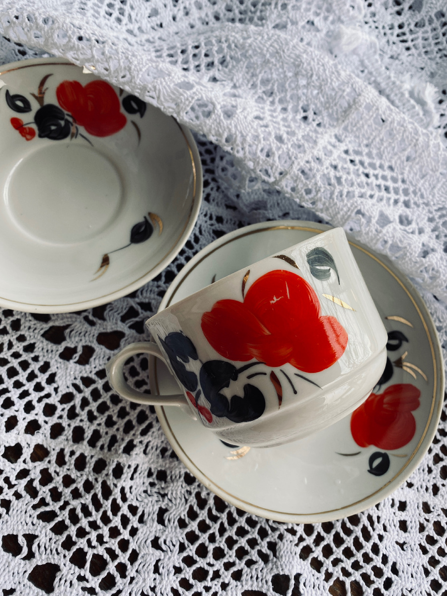 Это тот случай, когда гора сама пришла к Магомеду. Волей судьбы в моих руках оказались три винтажных чайных сервиза. Три разных росписи. Три разных формы. И каждый прекрасен по-своему. Проходите к столу, я представлю вас фарфорам🫠. Первый - Бориславского фарфорового завода. Форма довольно сдержанная. Создана в 1972 году, автор П.В. Щербонос. Называется «Легiнь». Чашечки сбитые, приземистые. Их изюминка - гребешки на ручках. И очень удобные хваты на ручках в форме петельки. Ручная роспись в лучших традициях Стендаля. Чайная пара для Кармен, не иначе💃. Использование ограниченной палитры, где доминируют насыщенный красный и глубокий черный, подчеркивает лаконичность формы и акцентирует внимание на деталях. Красный цвет, самоуверенный и пронзительный, напоминает о закатах над пышными вишневыми садами в пору цветения. Черный же добавляет настроения и элегантности. Вместе эти оттенки образуют интересный тандем, который играет на контрастах, создавая завораживающий эффект. А еще этому се