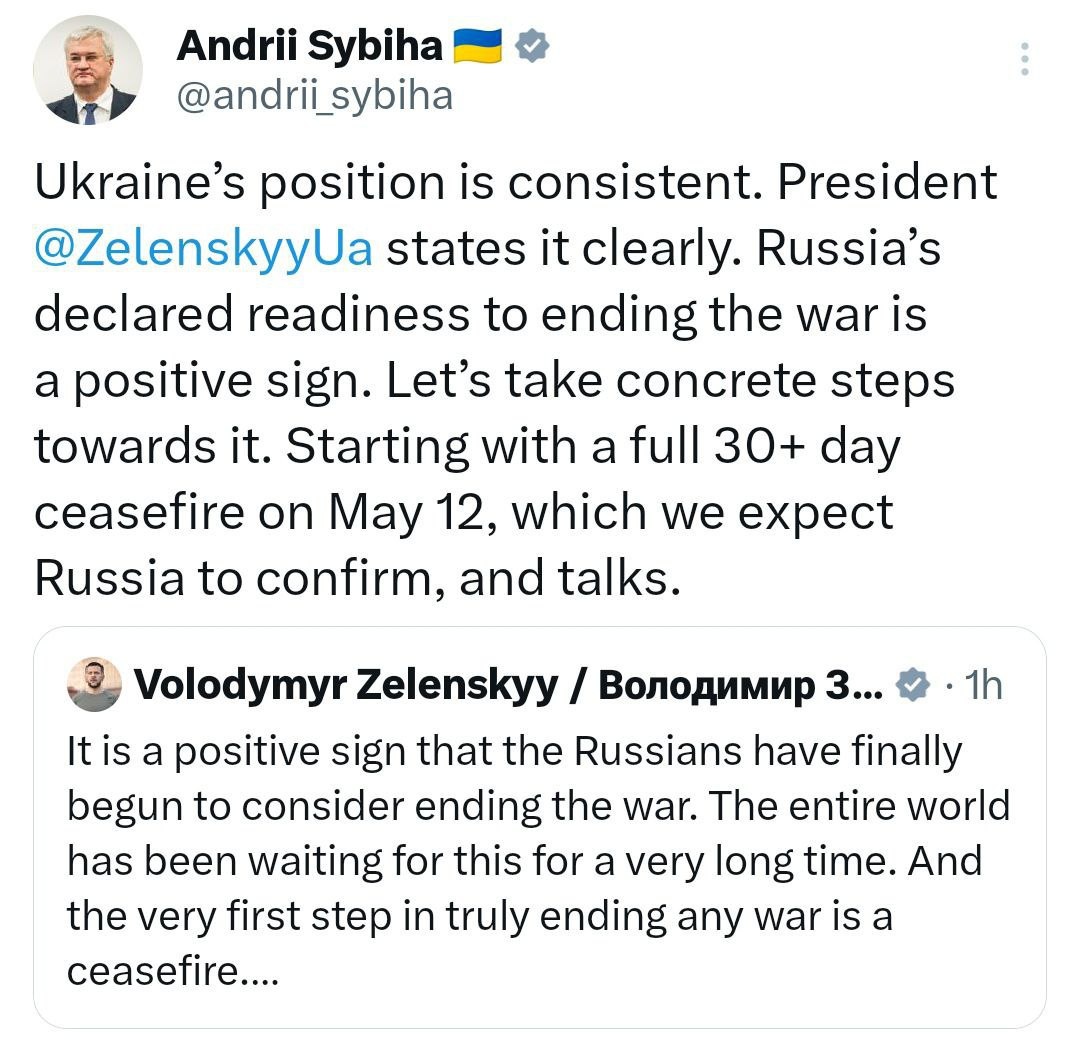 Here's Zelensky's FM on Putin's offer: really doubling down on that May 12 ceasefire