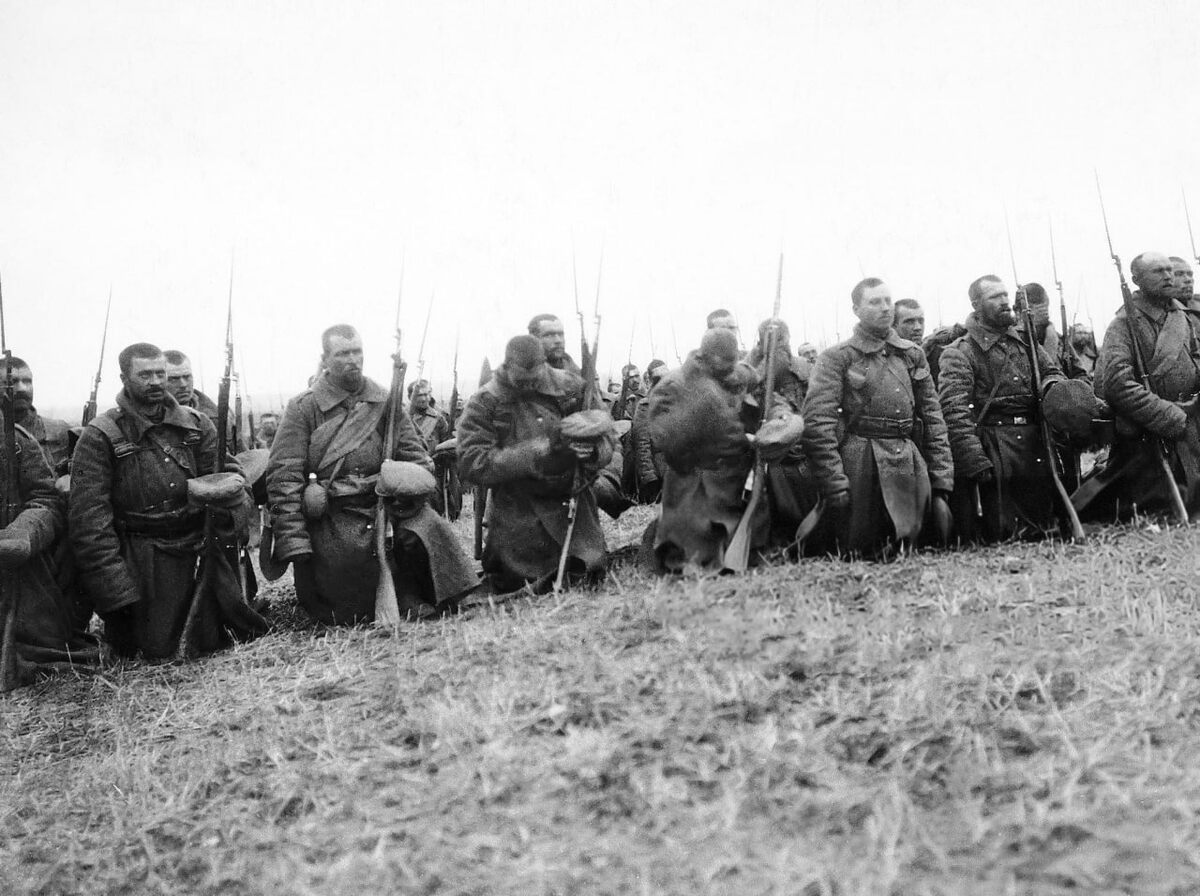 Солдаты Русской Императорской армии во время молитвы. Во время боев за предыдущий месяц, этот полк потерял половину солдат и был награжден Георгиевским знаменем, 1914 год. Фотограф Джордж Мьюз. Джордж Мьюз был единственный британским официальным фотографом Русской Императорской Армии, которого допустили на позиции русской армии на фронте. «Джордж Mьюз прибыл в ставку генерала Брусилова и быстро завоевал доверие русских офицеров. Его не ограничивали в работе, он, по существу, снимал всё, что хотел. Много путешествовал, рисковал конечно». Почти три года Джордж Мьюз был единственным британским фотографом-хроникером на Восточном Фронте. В 1915 году в Великобритании вышла книга Стэнли Уошберна «Полевые заметки с русского фронта». Стэнли Уошберн был специальным военный корреспондентом «Таймс» в русской армии. Мьюз фотографировал переправы и многодневные походы, за его машиной не раз устраивали охоту немецкие аэропланы. А в 1916 году англичанин, рискуя жизнью, вывез из-под обстрела раненн