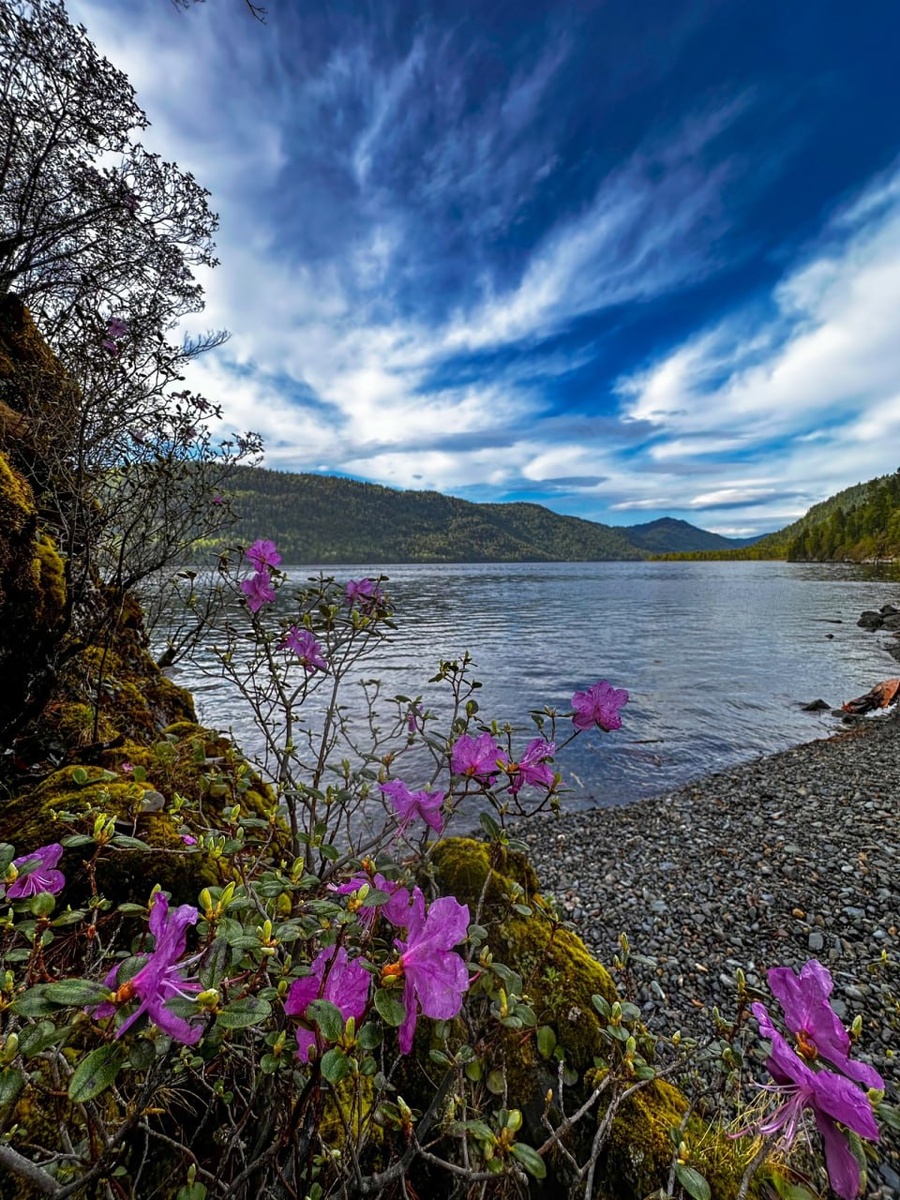 Весенние краски Алтайского заповедника. По берегам Телецкого озера прошёл пик цветения маральника, но местами ещё можно встретить обильно цветущий кустарник, нежно розовых красок добавляют цветки бадана толстолистного. Фото: Роман Воробьёв, Татьяна Клименко.