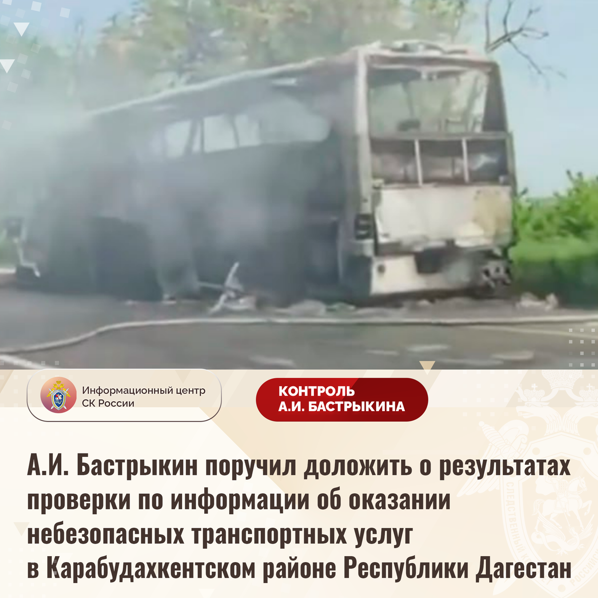 А.И. Бастрыкин поручил доложить о результатах проверки по информации об оказании небезопасных транспортных услуг в Карабудахкентском районе Республики Дагестан В СМИ сообщается, что 10 мая текущего года в Карабудахкентском районе Республики Дагестан на участке федеральной трассы вблизи поселка Ачи-Су произошло возгорание маршрутного автобуса, осуществлявшего перевозку 30 граждан. Получения телесных повреждений пассажирам удалось избежать благодаря своевременной эвакуации. В СУ СК России по Республике Дагестан по данному факту начата процессуальная проверка. Председатель Следственного комитета Российской Федерации Александр Иванович Бастрыкин поручил руководителю СУ СК России по Республике Дагестан Дмитрию Владимировичу Беляеву доложить о промежуточных результатах процессуальной проверки и принятом по итогам решении. Исполнение поручения поставлено на контроль в центральном аппарате ведомства. #СледственныйКомитет #СКРоссии #СКР #ИЦСКР #ИнформационныйЦентр #АлександрБастрыкин #Председат