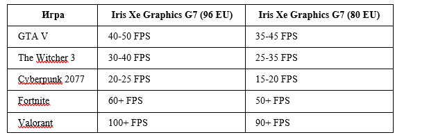 Intel Iris Xe Graphics (или Xe Graphics) — это название интегрированной графики, используемой в мобильных и настольных процессорах Intel Tiger Lake (11-е поколение), Alder Lake (12-е поколение), Raptor Lake (13-е поколение) и Meteor Lake (14-е поколение). Производительность Iris Xe Graphics сильно зависит от нескольких факторов, включая модель процессора, объем оперативной памяти (RAM) и конфигурацию охлаждения ноутбука. Поэтому просто говорить “Iris Xe Graphics” недостаточно, нужно указывать конкретную модель (например, Iris Xe Graphics G7 96EU). Давайте рассмотрим сравнение различных конфигураций Intel Iris Xe Graphics и их производительности: 1. Основные разновидности Intel Iris Xe Graphics: 2. Факторы, влияющие на производительность Iris Xe Graphics: 3. Сравнение производительности (приблизительно): 4. Сравнение с конкурирующими интегрированными решениями (примерно): 5. Примеры производительности в играх (приблизительно, 1080p, низкие/средние настройки): 6. Важные выводы: Чтобы пол