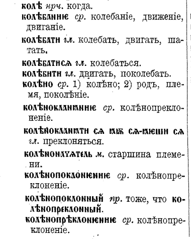 Этимологически предлагают различать слова КОЛО (круг) и КОЛ (шест), а слово КОЛЕНО относят к производному от КОЛО, приводя к значению округлого сочленения. В старославянском словаре много интересных производных можно рассмотреть. КОЛЕНО - это РОД, имеющий отношение к по-КОЛЕНию. Также интересными являются слова КОЛебание и КОЛяда. Следующим рассмотрим КОЛ, при чем слово КОЛЬНЫЙ - относящийся к КОЛу и КОЛЕСУ. То есть КОЛ и КОЛО - слова одного смыслового корня. Значения "круг" и "шест" - более позднее разграничение на центральную ось вращения и саму траекторию вращения. Ну и посмотрим оставшиеся слова: Обратим внимание, что КОЛЕДНИК - тот кто осуждаем церковью. Также в ряд с одним корнем идут такие слова как КОЛОДЕЦ и КОЛОКОЛ. КОЛ: KAAWL КА - Кристалл формирует реализаторские алгоритмы как внутриёмкостной процесс. Алгоритм реализации как «идея», имеющая логику перетекания в мире (подтверждена). КОЛ - альные алгоритмы материализации согласуют проявление кристаллических алгоритмо