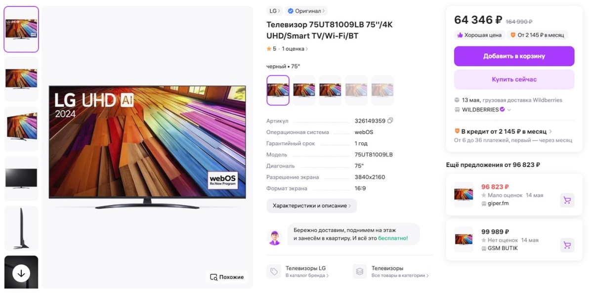 На Wildberries Телевизор 75" LG 75UT81009LB за 64346 рублей