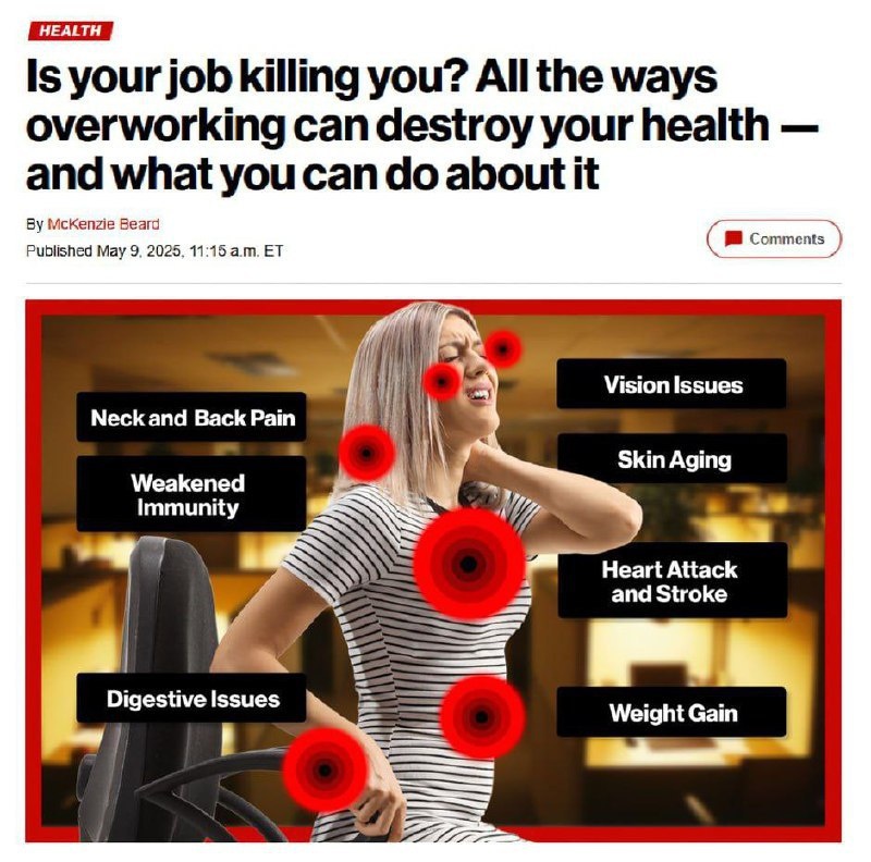 😱 ПОЧЕМУ ПЕРЕРАБОТКИ УБИВАЮТ ВАС МЕДЛЕННО Работа по 12 часов в день — это не «успех», а прямой путь к хронической тревожности, скачкам давления, бессоннице, болям в спине и даже кожным высыпаниям. 💥 Эти симптомы — не просто временные неудобства. Врачи говорят: длительные переработки действительно сокращают жизнь. И ни кофе, ни витамины тут не помощники. ☕ 💥 Что помогает? - Стабильный 7-часовой сон. - Питание по режиму. Если вы давно забыли, как выглядит нормальный вечер без работы, самое время задуматься. 🕰️ 👉 Узнайте больше в Первом Нейросетевом. #Здоровье | ВСЁ ПРО AI | AI NEWS | Дзен | ОК Что думаешь по этому поводу? Пиши в комменты! 🔥