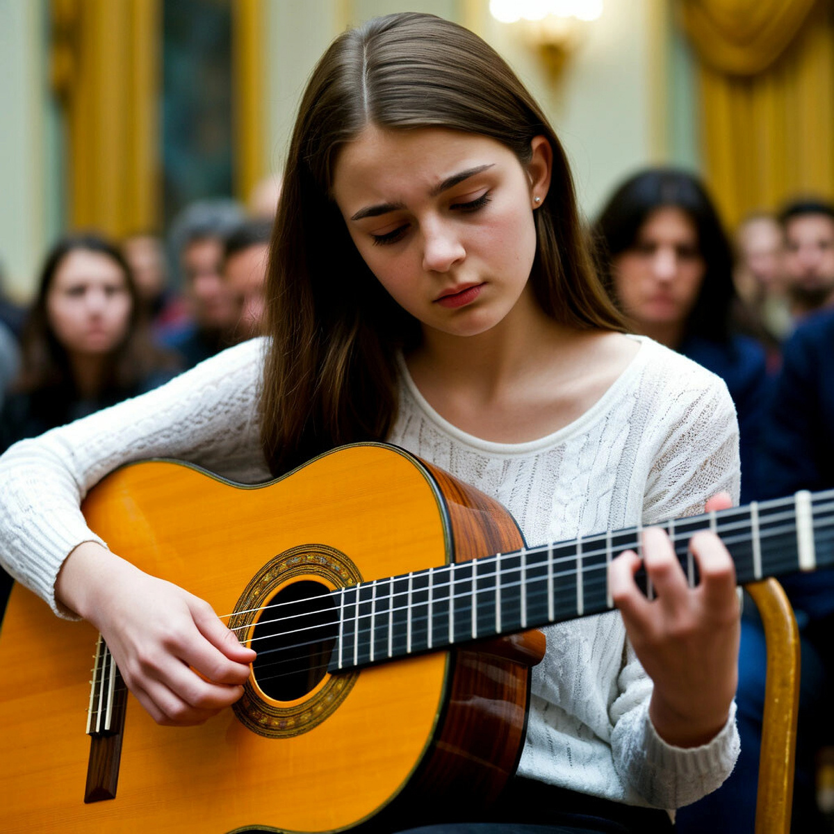 Волнение перед выходом на сцену — это нормально. Даже профессиональные музыканты испытывают лёгкую дрожь перед выступлением. А для учеников детской школы искусств, особенно в младших классах, страх сцены может стать настоящим препятствием. Но с ним можно справиться — и даже превратить сцену в место уверенности и радости. Вот несколько важных шагов, которые помогут гитаристу почувствовать себя спокойно и сосредоточенно. Первое и главное — чёткое знание музыкального произведения. Если в голове — путаница, если ноты учились «как-нибудь», то и на сцене будет неуверенность. А если всё разучено по полочкам — где какой аккорд, какая фраза, как начинается и заканчивается пьеса — страх уходит. Чем лучше ты знаешь свою программу, тем меньше шансов, что что-то пойдёт не так. Музыкальный текст должен быть не просто выучен, а “внутри” тебя. Не нужно ждать экзамена или концерта, чтобы сыграть перед людьми. Чем больше ты играешь при других — родителях, друзьях, одноклассниках — тем привычнее становит