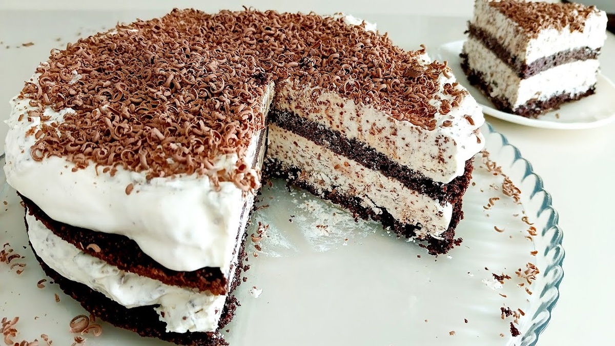 Торт мороженое «Эскимо». Бисквит: Кокосовая мука – 60 г.; Растительное масло – 40 г.; Какао порошок – 20 г.; Сахар – 90 г.; Яйца – 4 шт.; Соль – ¼ ч.л.; Разрыхлитель – 10 г. Начинка: Сливки жирные – 500 г.; Сгущённое молоко – 150 г.; Молочный шоколад – 100 г. Декор: Шоколад, ягоды, джем или варенье. Пищевая ценность продукта на 100 грамм: Белки – 7 г.; Жиры – 30 г.; Углеводы – 20 г.; Калорийность – 355 ккал. Способ приготовления: Яйца вымешиваю на высоких оборотах миксера с сахаром и солью. Добавляю растительное масло, кокосовую муку и какао-порошок. Перемешиваю миксером. Выкладываю в форму 18-20 см. Убираю в заранее разогретую до 170С духовку на 30 мин. Весь шоколад натираю на тёрке. Убираю шоколад в морозильник. Готовый бисквит оставлю на решётке, а затем убираю в холодильник. Сливки взбиваю на средних оборотах миксера со сгущённым молоком. Сливки хорошо взбил они устойчиво держат форму. Добавляю весь шоколад в крем и перемешиваю. Крем убираю в холодильник. Холодный бисквит