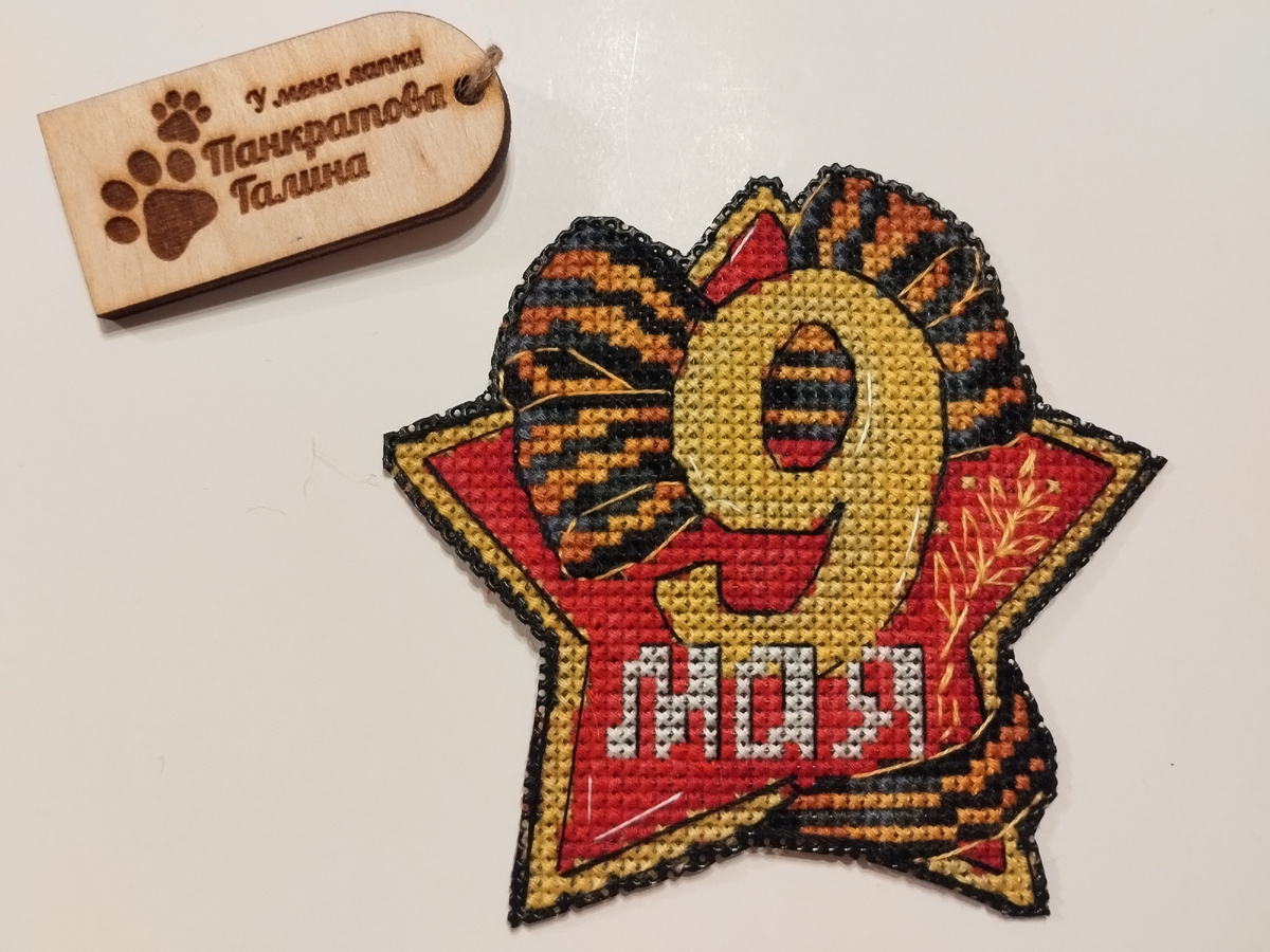 К 9 мая я вышила одну из схем совместника "80 лет Победы", организованный группой funny_stitch Совместник бесплатный, дизайнеры предлагали очень много трогательных схем. Сейчас совместник подходит к концу, и есть такие скоростные вышивальщицы, которые вышили более 15 схем! Я же домучала только одну и взяла вторую, и тоже этим очень довольна! Итак, схема от Ольги Болачковой Авторские схемы Ольги Болачковой, название схемы "9 мая". Вышивала на черной пластиковой канве нитками аналогом ДМС. Всего 13 цветов плюс бленд, 50*48. Вышивала около месяца. Это, конечно,долго, но у меня много и других схем в работе, и времени в последний месяц было очень мало на рукоделье (как вы видите из моих недельных отчетов))). Вышитую схему сразу оформила: самоклеющийся фетр и на клей-карандаш приклеила застежку от бейджа)). Уже выгуляла на праздничные мероприятия!