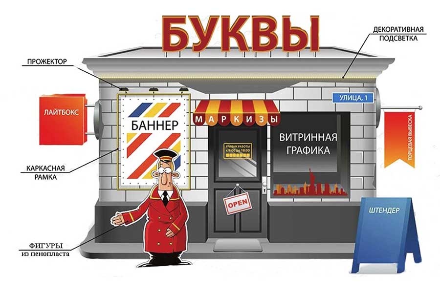 Размер букв тоже важен. Для улицы — минимум 10 см высотой. Иначе никто не прочтёт.