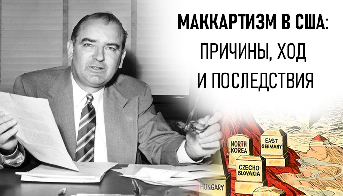 Что касается Советского Союза, то в конце 1940-х – начале 1950-х гг. в стране проводились массовые кампании по борьбе с космополитизмом и низкопоклонством перед Западом. Кампании были направлены на сокращение любых, и в первую очередь культурных связей советского общества с Западным миром. Пострадали от этого, прежде всего, деятели культуры и науки. В Соединенных Штатах в это же время проводились аналогичные процессы, которые, однако, были направлены против лиц, уличённых в связях с коммунистической партией. Инициатором данной кампании был сенатор-республиканец Джозеф Маккарти, по фамилии которого данное движение и получило свое название – маккартизм. Разберу это явление подробнее.