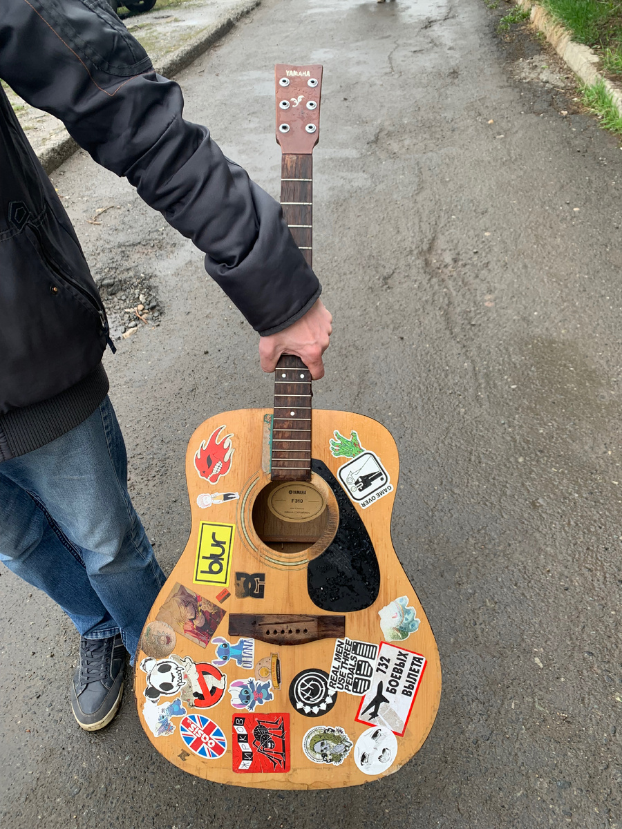 Сегодня 11 мая. Льет за окном дождь. Завтра приедет мой компьютерный столик , за которым я буду писать свою книгу. А вчера был удивительный день. Хотя дождь лил точно также. Мы с мужем пошли прогуляться до почты. Я взяла зонт. Мы шли не спеша. По времени прогулка заняла наверное минут пятнадцать. Когда мы пришли на место, почта была закрыта. Перерыв. Ещё двадцать минут нужно где - то погулять, убить время. Мы пошли в магазин «Пятерочка», что в соседнем дворе. Набрав разных вкусностей к чаю мы снова заглянули на почту и в этот раз она была открыта. Получив посылку, мы отправились в сторону дома и вот проходя мимо мусорки я вдруг увидела …гитару!Она лежала поверх кучи из досок. Струны и колки на ней отсутствовали, а в голосник был воткнут старый зонт. Это была концертная акустическая гитара Yamaha 310…Корпус и гриф гитары были целы, только верхняя дека немного была повреждена в месте стыка с обечайкой, она немного отклеилась , а лак потрескался. Вся поверхность гитары была украшена разного рода наклейками. Эту гитару любили, на ней играли, возможно хозяин был любителем рок музыки…Наверняка у неё была очень интересная история и на ней играло не одно поколение, так как наклейки были разного рода, начиная от персонажей детских мультфильмов про приведений и заканчивая черепами и изображениями страшных монстров. Были также наклейки-надписи на английском , аниме из корейских мультфильмов, пауки, самолеты, эмблемы, флаги. Капли дождя падали на гитару и стекали струйками по лакированной поверхности. Мы ушли , вернулись…снова ушли…остановились в нескольких метрах и стали думать. Муж сомневался…я хотела, забрать. Нет я не могла пройти мимо такой красоты!Да здесь очень много придется реставрировать и даже не факт, что она снова будет играть. Изнутри гитара разбухла , размокнув от дождя, отсутствовали некоторые детали. Мы не знали каким будет звучание, но в качестве экспоната старинного музыкального инструмента я непременно хотела её видеть у себя дома в интерьере, в музыкальном уголке, где у нас стоят проигрыватели разных моделей и стеллаж с пластинками. Гитара излучала бешенную энергетику, она была хороша даже без струн, сама по себе. И мы забрали её!Я ликовала.Теперь надо хорошенько её просушить, сделать обработку от насекомых на всякий случай, заклеить, покрасить, натянуть струнки и поставить на подставку на самое видное место. В уме я уже представила даже как я буду её рисовать и какой поставлю натюрморт. Пока мы шли домой, муж заказал цветные струны. Осталось только найти колки, с помощью которых они натягиваются. Это оказалось не так просто. Модель гитары старинная и запчасти к ней тоже редкость.Нам попалась раритетная вещь. Мы обязательно тебя восстановим, моя хорошая, только потерпи.Вот такой замечательный дивный день был вчера. За окном льет дождь, а на душе светло и радостно от предчувствия. Скоро мы подарим нашей сиротке новую жизнь. Скоро она запоет и расскажет свою трагичную историю. Историю любви и предательства. Я верю, что у каждого инструмента, как и у людей , есть душа. Она тоже плачет или смеется в зависимости от того, какой человек к ней прикасается.Я с детства любила играть на гитаре и сочинять свои песенки и мелодии. Я это делала на слух. В школе я ходила в кружок игры на гитаре, но не долго, преподаватель ушел. Мечта осталась и однажды мой