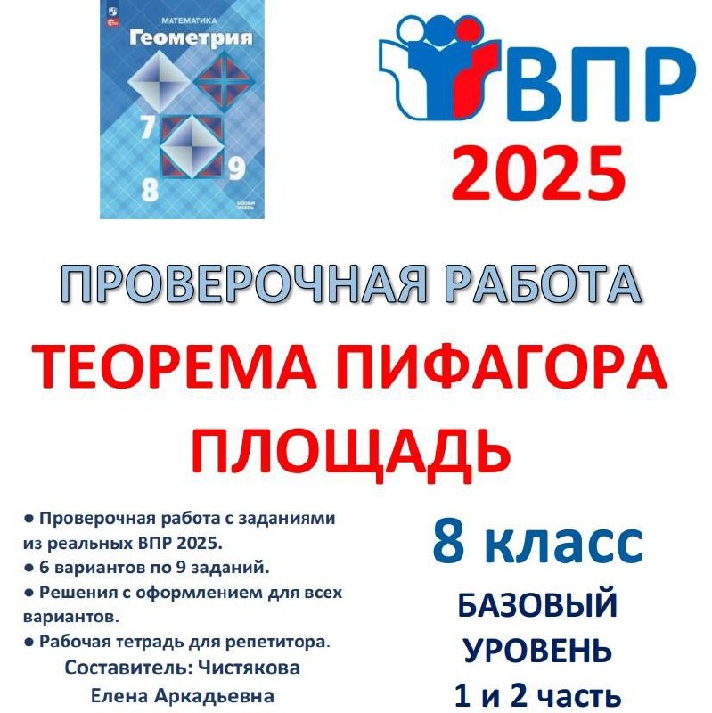 ❗Внимание❗✨Новинка✨ 🆗ВПР 8 класс Математика Проверочная работа "Теорема Пифагора. Площадь" 📥 Скачать на WB: digital.wildberries.ru/offer/473631 Составлены из заданий демоверсии и всех заданий реальных вариантов 2025 года , которые нам удалось найти по данной теме. 3 файла PDF: 🔹файл для учителя (6 вариантов по 9 заданий, 6 страниц); 🔹файл с подробными решениями для всех вариантов (13 страниц); 🔹файл репетитору для двух вариантов со свободным местом для записи решения (8 страниц). В течение всего учебного года в процессе изучения каждой темы сможете попутно прорешивать задания из ВПР. 📚 Все материалы в таблице: vk.cc/cHlmAx