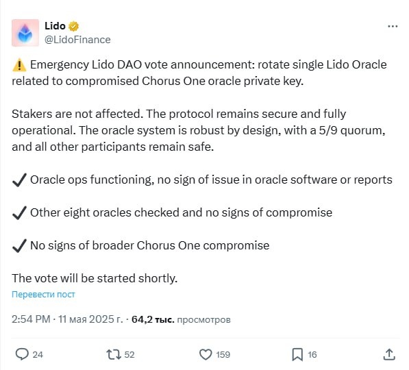 🏴☠️ Lido Finance сообщила о предполагаемой утечке приватного ключа у своего партнера Chorus One, в связи с чем Lido DAO проведет экстренное голосование по замене соответствующего узла оракула. Протокол по-прежнему функционирует безопасно, а средства стейкеров не пострадали. Система оракулов Lido защищена мультиподписью 9 из 5, и на остальных 8 узлах признаков взлома не обнаружено.