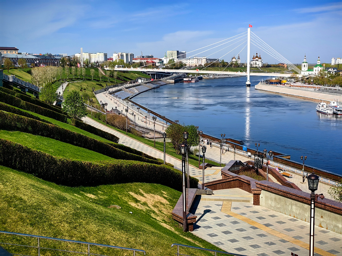 Отличный обзор на набережную открывается со смотровой – тут тебе и все ярусы, как на ладони, и мост Влюбленных – пешеходный мост над Турой, где несколько лет назад был зарегистрирован рекордно долгий поцелуй.
